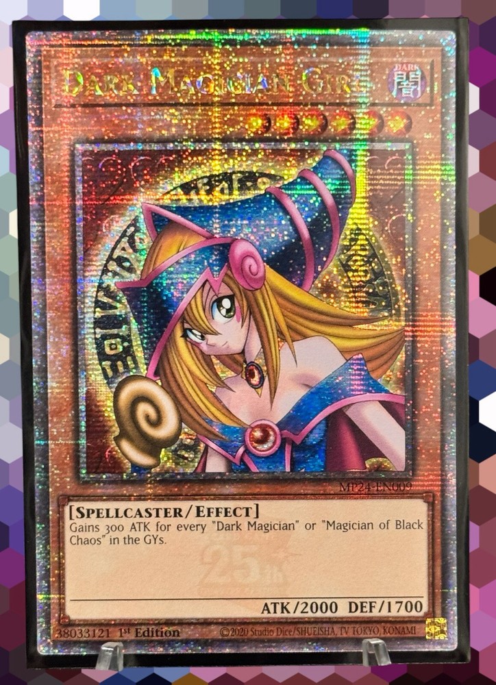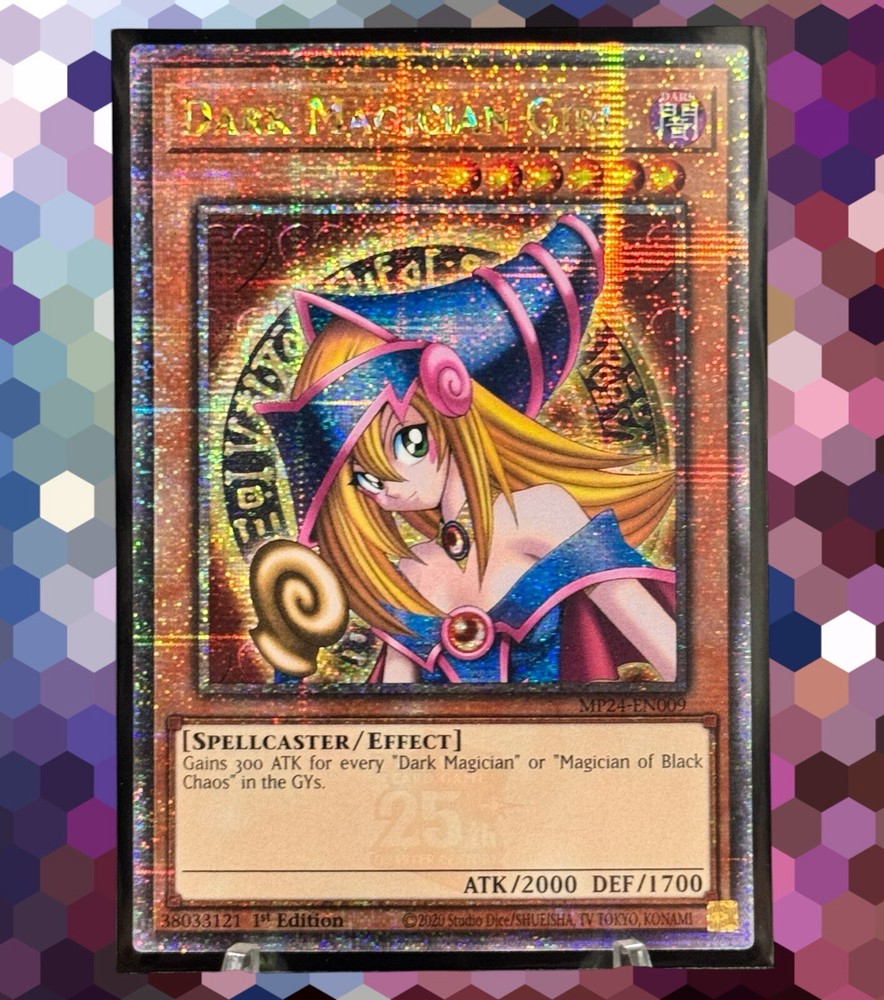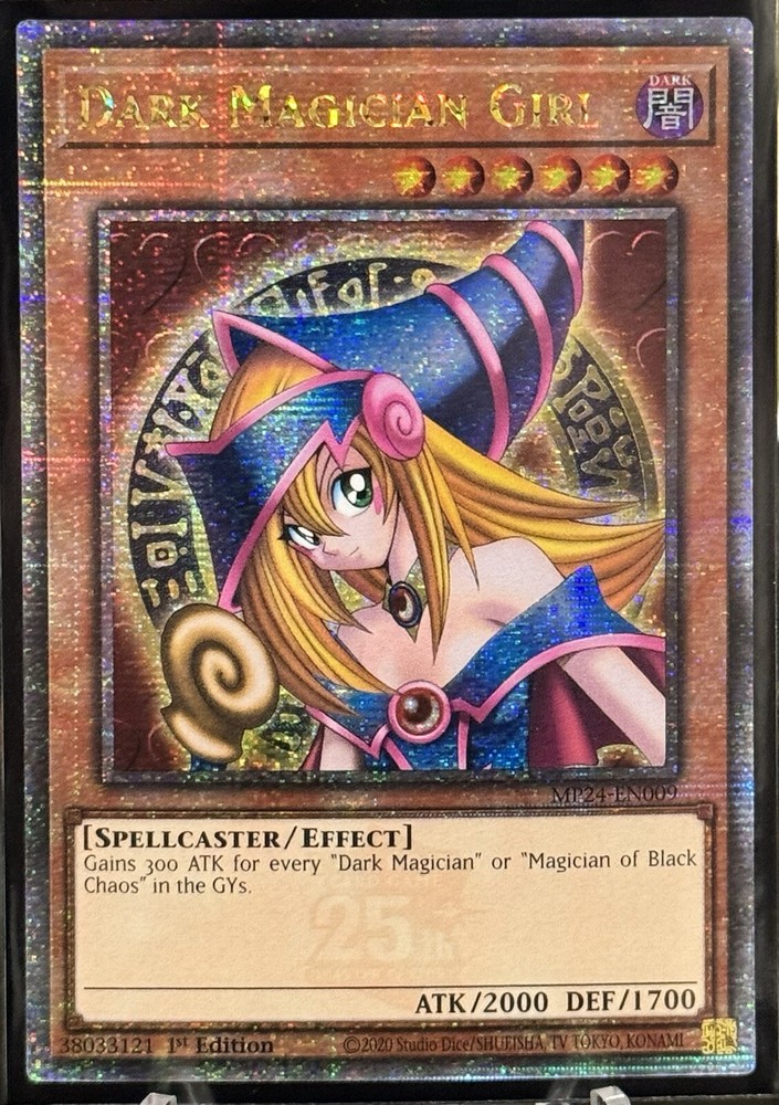 This YuGiOh! card is a must-have for any collector or player. It features Dark Magician Girl [MP24-EN009] in its Quarter Century Secret Rare form, with a stunning Holo finish. This card is a 1st Edition NVP, making it a rare find for those looking to add to their collection. With an attack/power of 2000 and a defense/toughness of 1700, this Effect card is perfect for those looking to use it in their next game. Its rarity and uniqueness make it a valuable addition to any collection. Don't miss out on the chance to own this one-of-a-kind card. - Card(s) come double-sleeved - Never played; pack to sleeve - Near mint or better *Due to multiple copies, the one(s) received may not match image* *Shipping cost includes packing supplies* - Color-coded sleeve(s) - Top loader - Cardboard sleeve - Stay flat Cardboard mailer