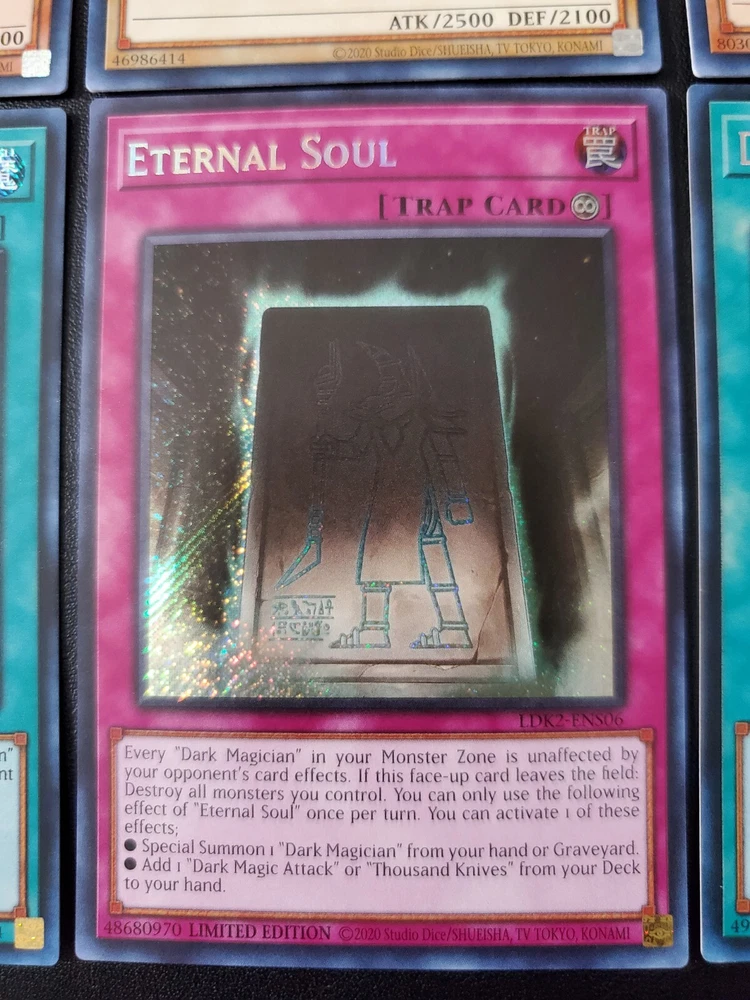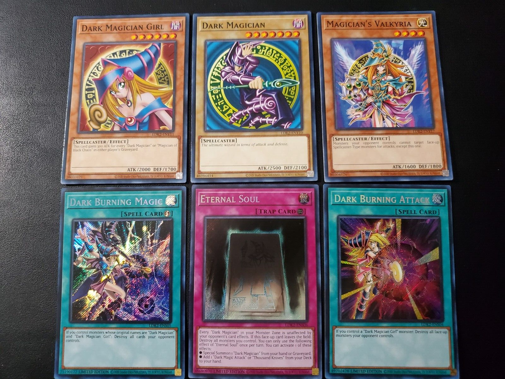 DESCRIPTION Yu-Gi-Oh! Dark Magician Girl Set Valkyria, Dark Burning Attack, Eternal Soul Item Includes: 1x Dark Magician (Common, LDK2) 1x Dark Magician Girl (Common, LDK2) 1x Magician's Valkyria (Common, LDK2) 1x Dark Burning Attack (Secret Rare, LDK2) Holo 1x Dark Burning Magic (Secret Rare, LDK2) Holo 1x Eternal Soul (Secret Rare, LDK2) Holo 6 -Card Set (Buyer receives all 6 cards!) SHIPPING We ship up to 3 day after payment, except for holidays and weekend or when the delivery service is not available. FOR UNITED STATES CUSTOMERS: We use First Class for all kind of shipments, this include tracking number and the estimated delivery day is between 3 to 5 days, If you need a faster service send us a Message and we will help you to choose it. FOR INTERNATIONAL CUSTOMERS (outside united states): International shipping prices differ for each country and are calculated automatically by eBay. Tracking information is not available for international buyers beside Canada, once the package leave the US, the buyer have complete responsibility for that shipping. All duties and taxes are the responsibility of the buyer. They are not included in the listed price. Please check with your domestic customs office to determine what your additional costs will be prior to bidding. If you need to combine shipping please send us a message to help you.