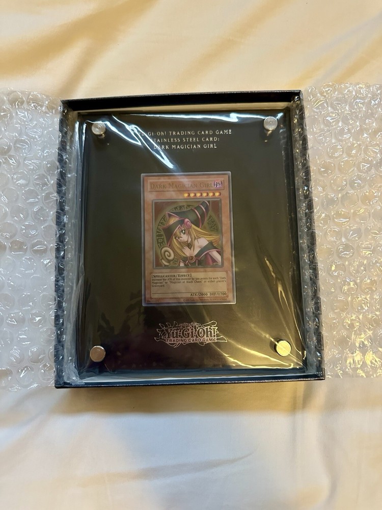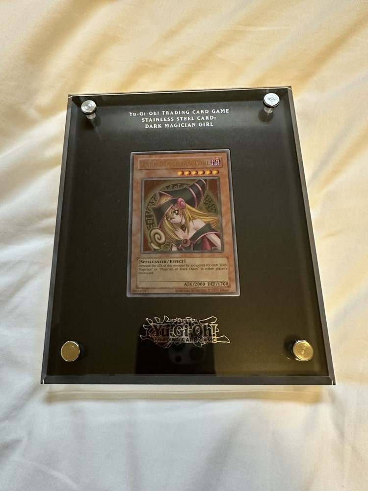 The Yu-Gi-Oh! Dark Magician Girl Stainless Steel Limited Edition card is a collector's item featuring the popular character Dark Magician Girl from the Yu-Gi-Oh! trading card game. This metal card is manufactured by Konami in Japan. It is an Effect type card with limited edition features, making it a sought-after item for fans and collectors of the Yu-Gi-Oh! TCG. **Card has never been removed from acrylic case. Acrylic case has been stored safely in the box without any scratches.