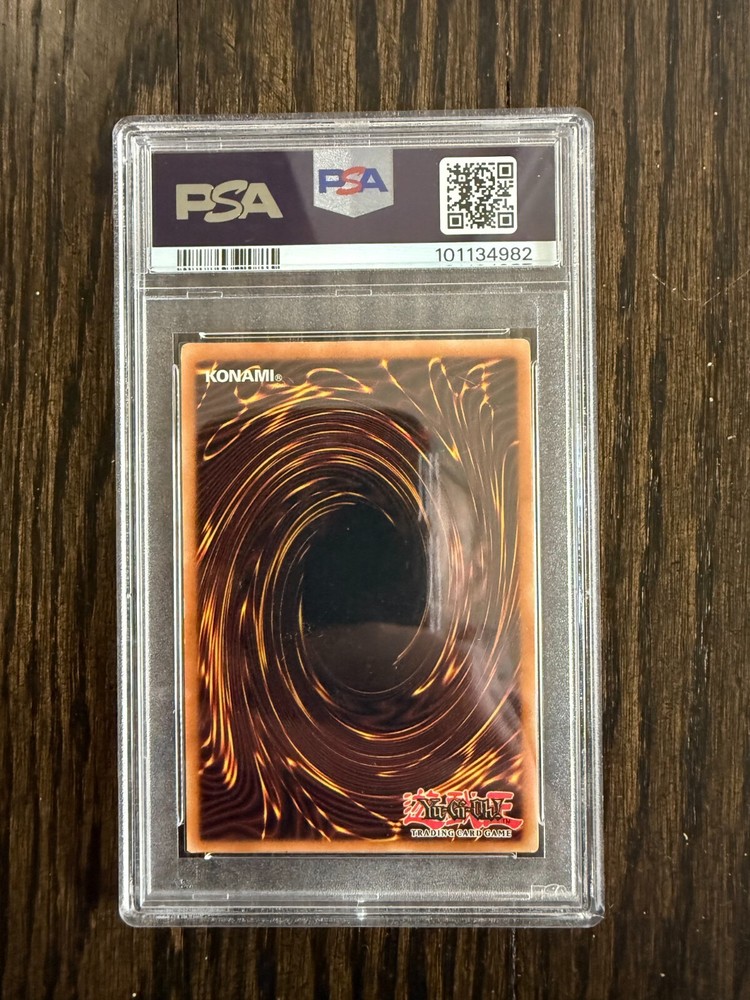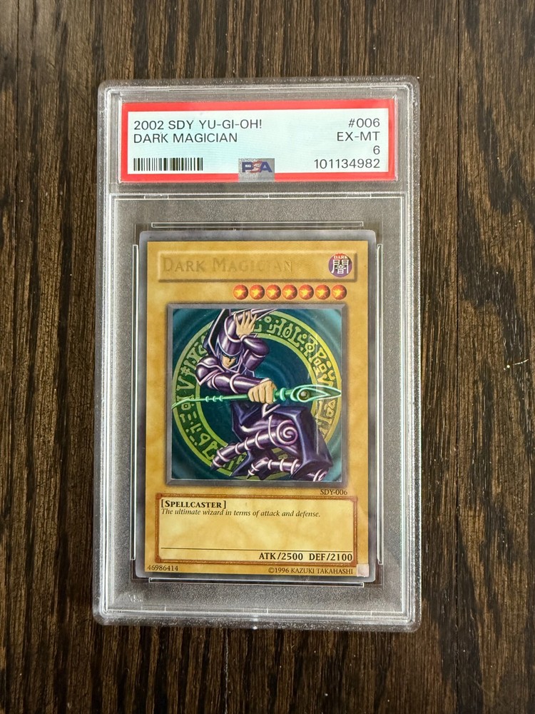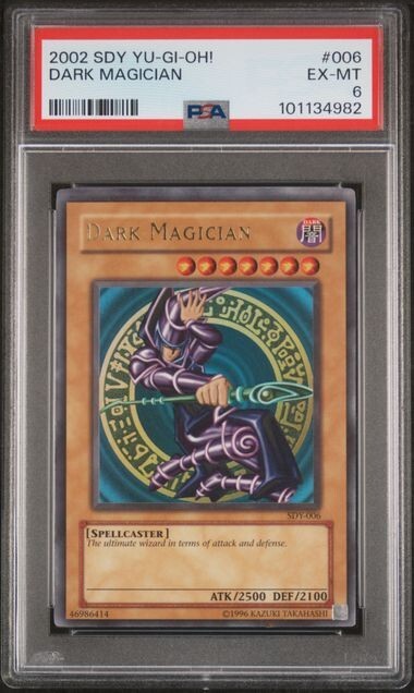 The product is a Yu-Gi-Oh! trading card featuring the Dark Magician. It is from the Starter Deck: Yugi set and has a Dark attribute. The card is a Spellcaster monster with 2500 Attack and 2100 Defense points. It is an Ultra Rare card with English language text and a Holo finish. The card is manufactured by Konami and has the card number SDY-006. Holo PSA Graded 6