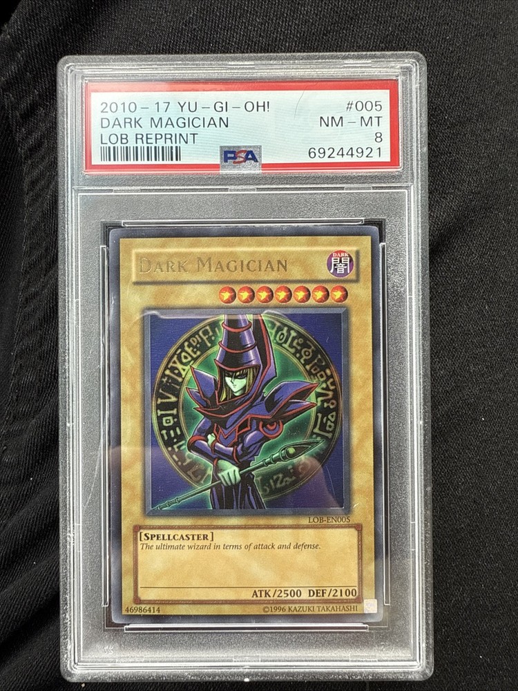 Unleash the power of the iconic Dark Magician with the YuGiOh Legend of Blue Eyes - DARK MAGICIAN LOB-005 Reprint Unlimited card. This Ultra Rare collectible from the legendary Legend of Blue Eyes White Dragon set is a must-have for any serious Yu-Gi-Oh! TCG enthusiast. The card features the enigmatic Dark Magician, rendered in rich detail and vibrant colors that capture the essence of this timeless character. Graded a solid 8 by the Professional Sports Authenticator (PSA), this piece boasts a pristine Mint condition, ensuring its quality and authenticity. The card is presented in English and carries the attributes of the Dark color, adding to its mystique and allure within the game's universe. Add this legendary card to your collection and enhance your gameplay with the cunning Dark Magician's skills.