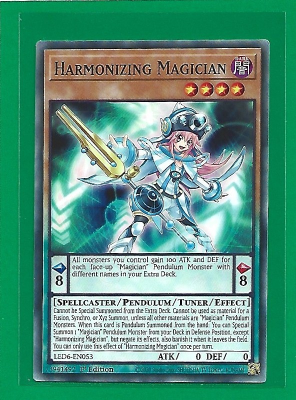 This Yu-Gi-Oh! trading card features the Harmonizing Magician from the Magical Hero set and is #LED6-EN053. It is in excellent condition and would make a great addition to any collection. Please see photos for your assessment of the condition. This card will be shipped in a pwe with a penny sleeve, card saver or top loader, and a team set bag.