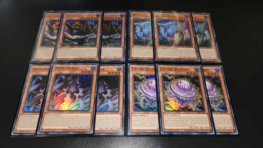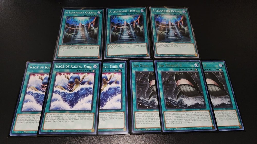 DESCRIPTION Yu-Gi-Oh! Legendary Ocean Mako Tsunami Water Deck Collection MONSTERS: 3x Mega Fortress Whale (ultra rare) 3x Ocean Dragon Lord - Kairyu-Shin (ultra rare) 3x Citadel Whale 3x Electric Jellyfish (super rare) 3x Doom Kraken (super rare) 3x The Legendary Fisherman 3x The Legendary Fisherman II 3x The Legendary Fisherman III 2x Warrior Of Atlantis SPELL 3x A Legendary Ocean 3x Sea Stealth II 3x Rage of kairyu-Shin 3x Fury Of Kairyu-shin 1x Terraforming TRAP 3x Torrential Tribute 3x Sea Stealth Attack 3x Kairyu-Shin's Dark Reef (rare) You will receive every card that pictures show! bid with confidence. **Sleeves not Included** SHIPPING We ship up to 3 day after payment, except for holidays and weekend or when the delivery service is not available. FOR UNITED STATES CUSTOMERS: We use First Class for all kind of shipments, this include tracking number and the estimated delivery day is between 3 to 5 days, If you need a faster service send us a Message and we will help you to choose it. FOR INTERNATIONAL CUSTOMERS (outside united states): International shipping prices differ for each country and are calculated automatically by eBay. Tracking information is not available for international buyers beside Canada, once the package leave the US, the buyer have complete responsibility for that shipping. All duties and taxes are the responsibility of the buyer. They are not included in the listed price. Please check with your domestic customs office to determine what your additional costs will be prior to bidding. If you need to combine shipping please send us a message to help you.