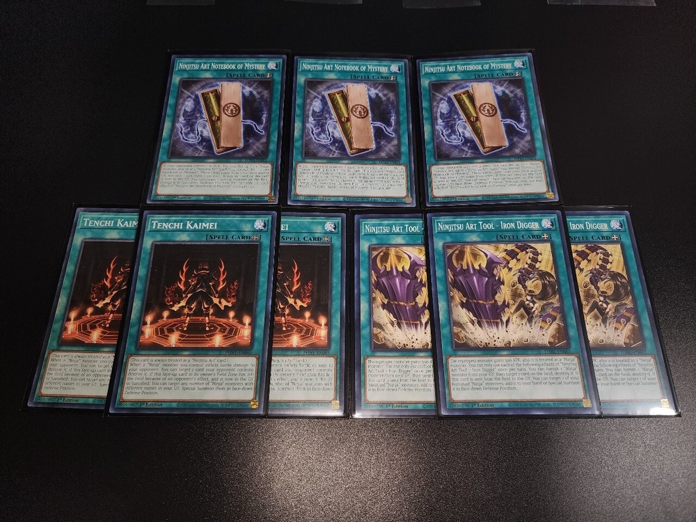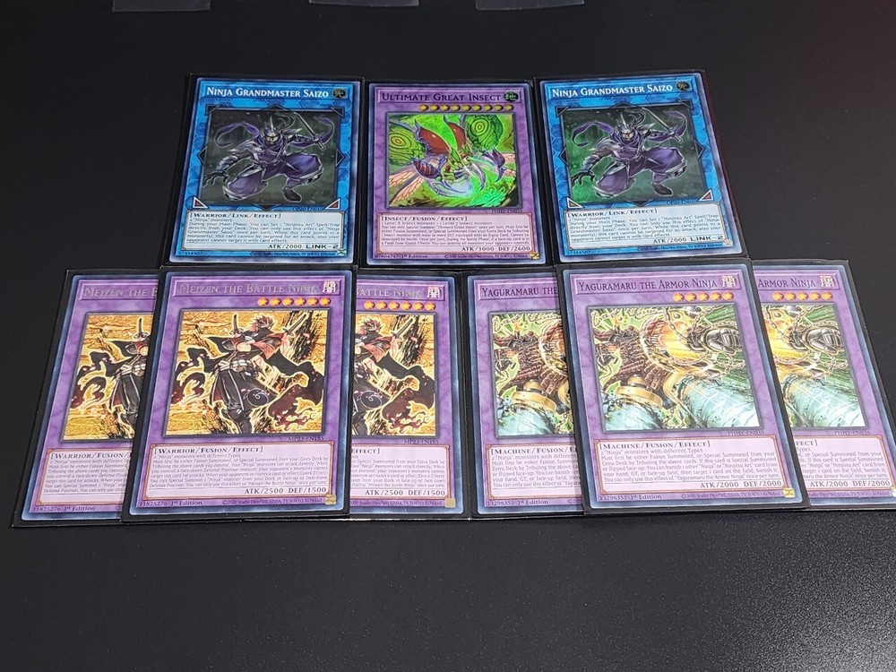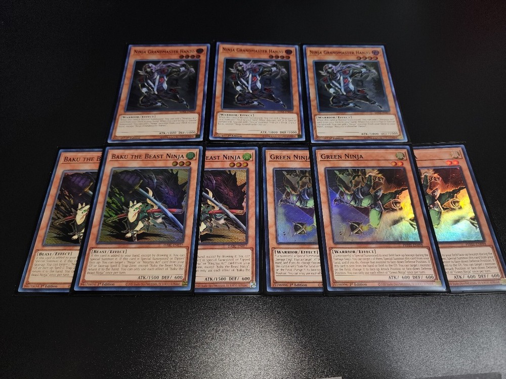YuGiOh Ninja Deck , Grand Master Hanzo, Mitsu, Meizen MONTERS 3x Ninja Grandmaster Hanzo (super rare) 3x Green Ninja (super rare) 3x Baku The Beast Ninja (super rare) 3x Mitsu The Insect Ninja (rare) 3x Tobari The Sky Ninja 3x Kagero The Cannon Ninja 3x Jioh The Gravity Ninja SPELL 3x Ninjutsu Art Notebook of Mystery 3x Ninjutsu Art Tool - Iron Digger 3x Tench Kaimei 2x Book Of Moon 1x Reinforcement of the Army EXTRA 2x Ninja Grandmaster Saizo (super rare) 3x Meizen The Battle Ninja (rare) 3x Yaguramaru The Armor Ninja 1x Ultimate Great Insect