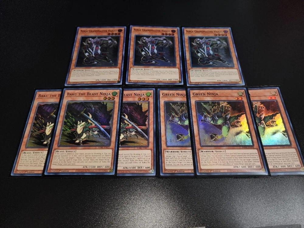 DESCRIPTION YuGiOh Ninja Deck , Grand Master Hanzo, Mitsu, Meizen MONTERS 3x Ninja Grandmaster Hanzo (super rare) 3x Green Ninja (super rare) 3x Baku The Beast Ninja (super rare) 3x Mitsu The Insect N...