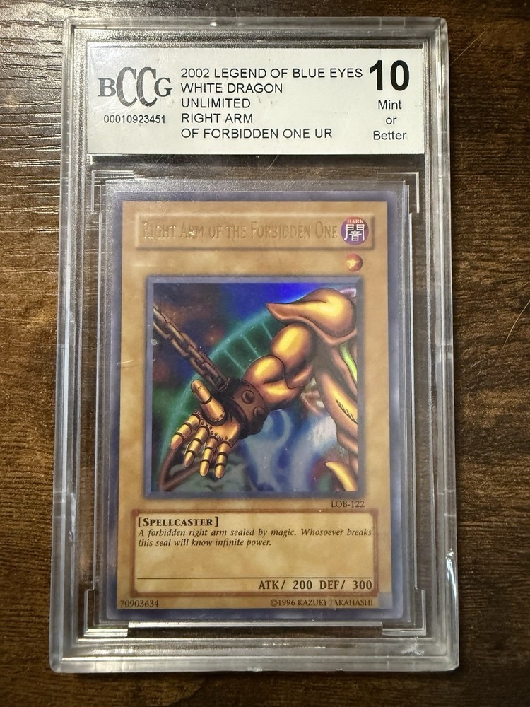 Yu-Gi-Oh TCG: 2002 Right Arm of the Forbidden One LOB-122 Ultra Rare BCCG 10 BCCG MINT 10! Slab is in perfect condition. Please review photos carefully, item pictured above are the exact items you will be receiving! Graded cards are wrapped in bubble wrap for maximum protection and shipped in a box. All orders are shipped within 48 hours! NO RETURNS! US SHIPPING ONLY!