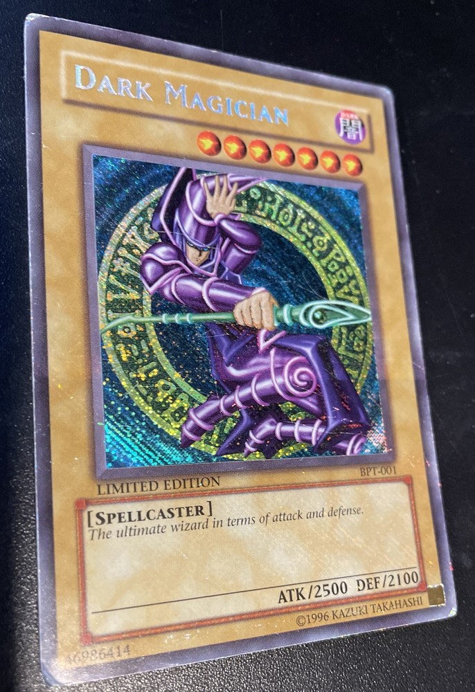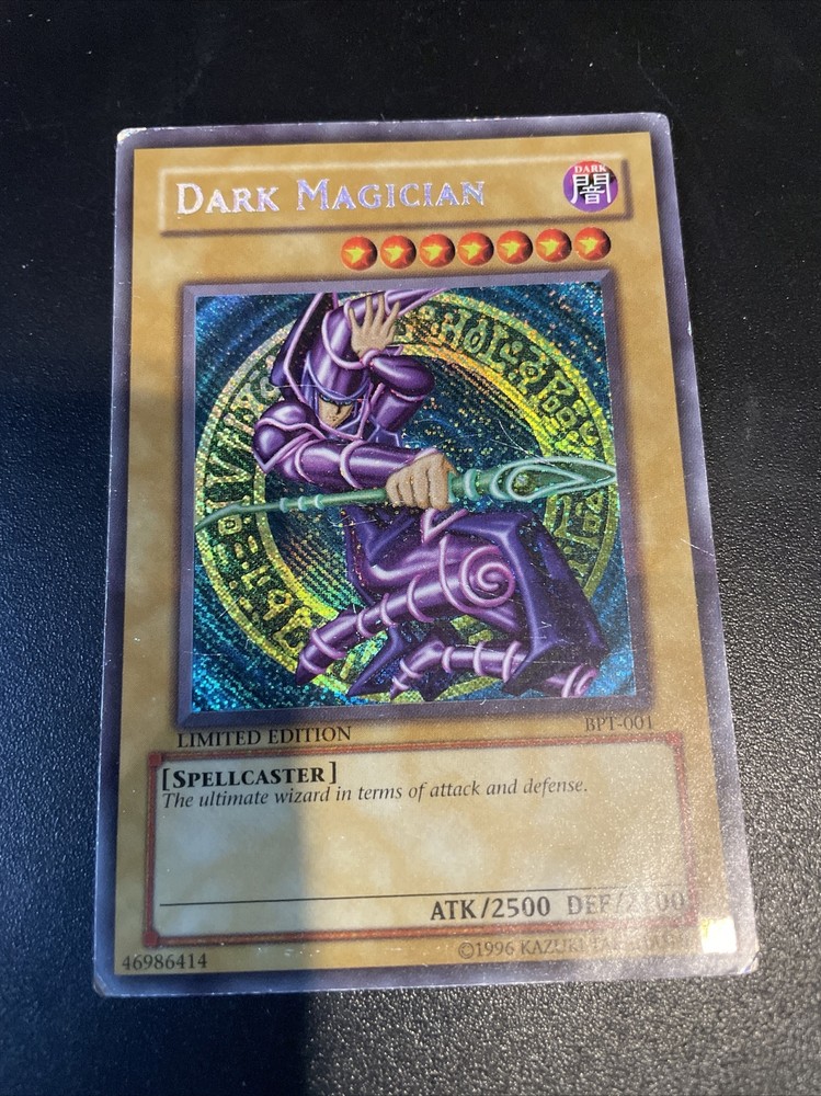 Dark Magician - 2002 Collectors Tin (BPT) Product Details The ultimate wizard in terms of attack and defense. Number: BPT-001 Rarity: Secret Rare Attribute Monster Type/Card Type: DARK Spellcaster/Normal Monster Level: 7 A / D: 2500 / 2100 Artist: Spellcaster