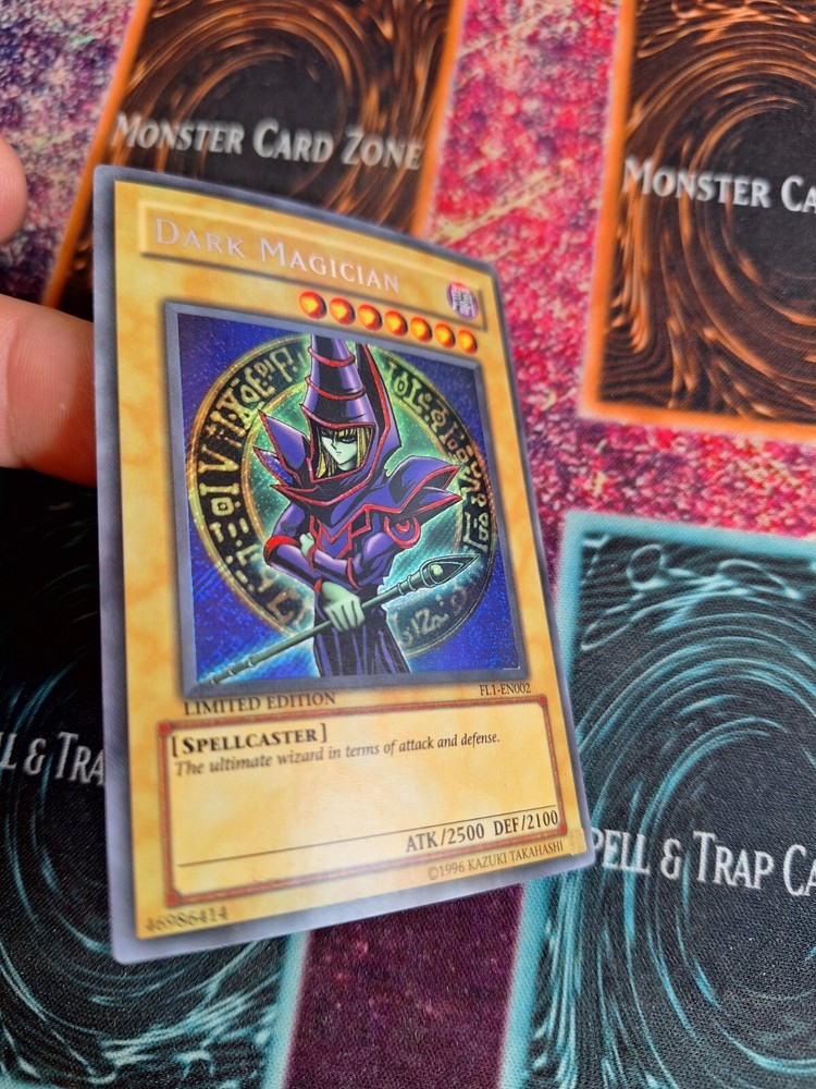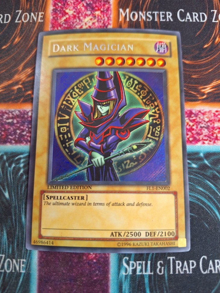 Yu-Gi-Oh! TCG Dark Magician FL1-EN002 Secret Rare Limited NM/LP. Some scratches and smuding on back. Slight curl. Could be pressed down with weight....