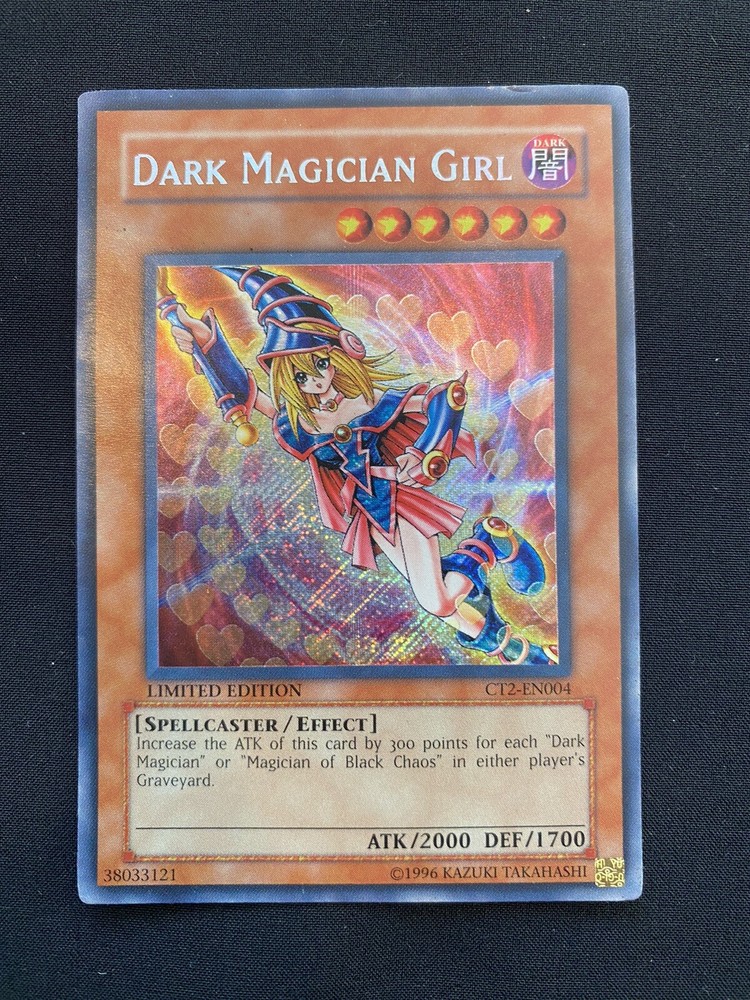 Please judge the condition of the card based on the pictures. This Yu-Gi-Oh! TCG card features the Dark Magician Girl, with a limited edition secret rare rarity. It belongs to the 2005 Collector's Tins set and has the card number CT2-EN004. The card is an effect type, with a spellcaster creature/monster type and a defense/toughness of 1700. It was manufactured in 2005 and has the attribute/color of dark. The card's attack/power is 2000, making it a formidable addition to any collection.