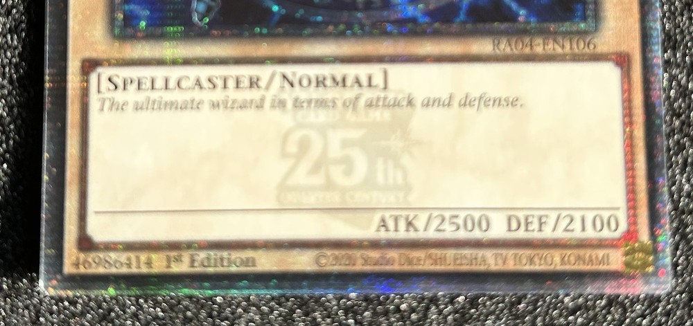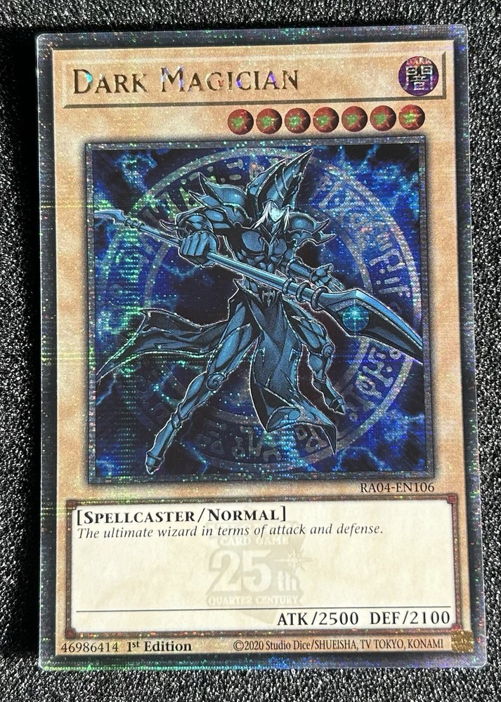 Delve into the mystical world of Yu-Gi-Oh! TCG with the enigmatic Dark Magician card from the Quarter Century Stampede set. This Spellcaster-type card, boasting the prestige of a Quarter Century Secret Rare, is a must-have for collectors and duelists alike. Its holographic finish captures the essence of the Dark Magician's cunning, making it a standout piece in any collection. This 1st Edition card, numbered RA04-EN106, is a testament to the enduring legacy of Konami's craftsmanship. Ungraded, it preserves its untouched charm, allowing you to appreciate its English language detailing and the card's normal type status. Add this spellbinding card to your arsenal and conjure up victory in your next battle.