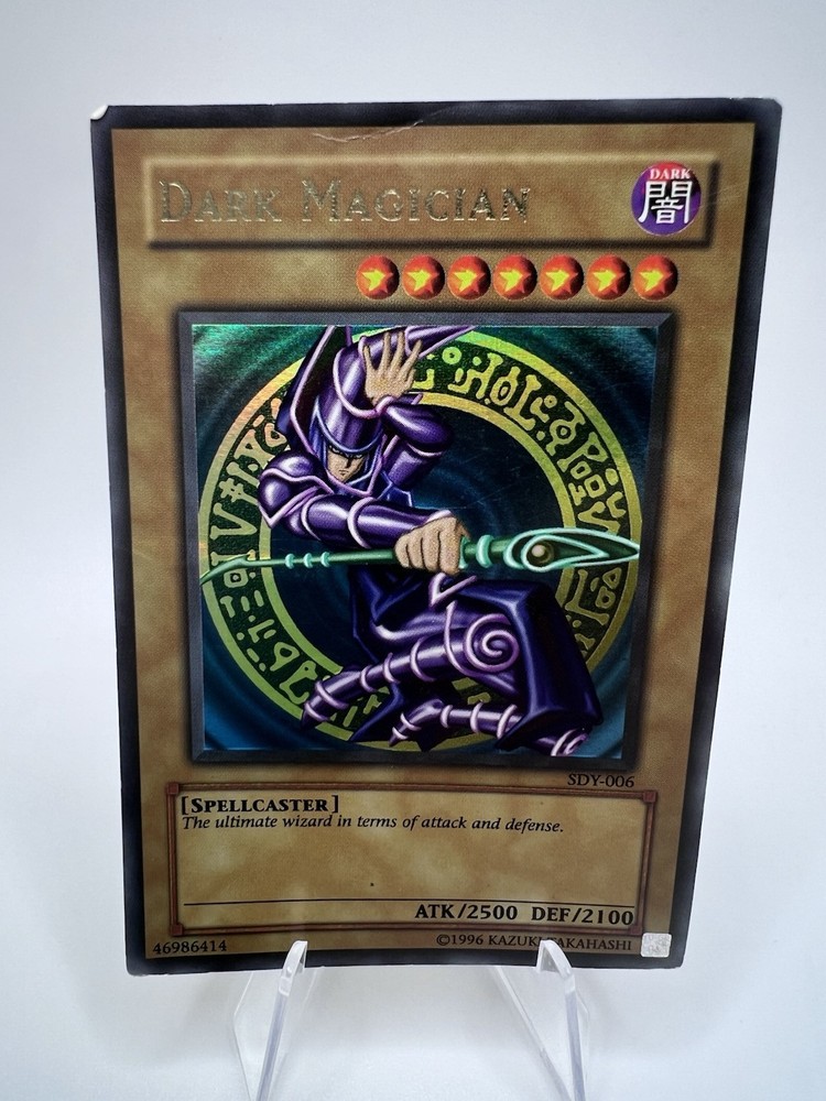 Yu-Gi-Oh! TCG Dark Magician SDY-006 with heavy wear. Card is warped with creases and corner/edge wear....