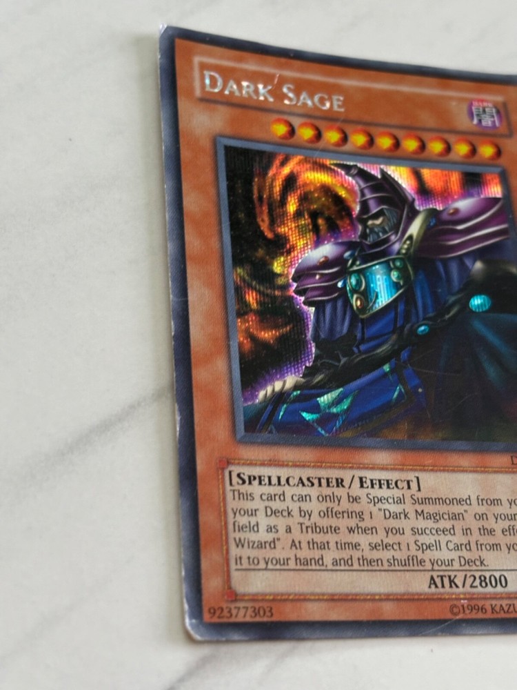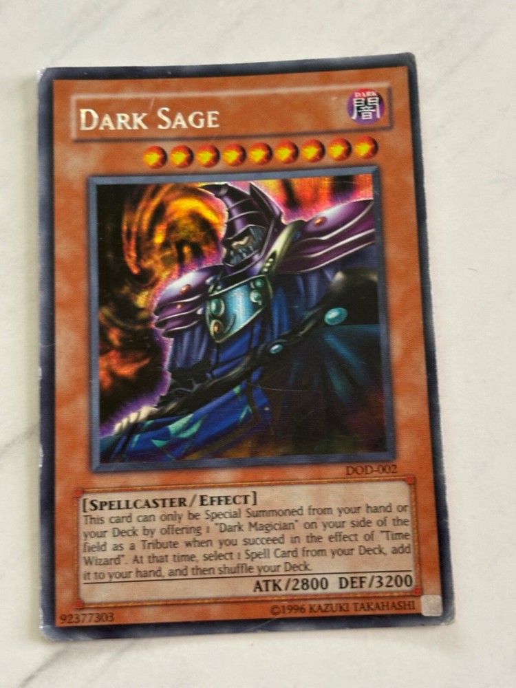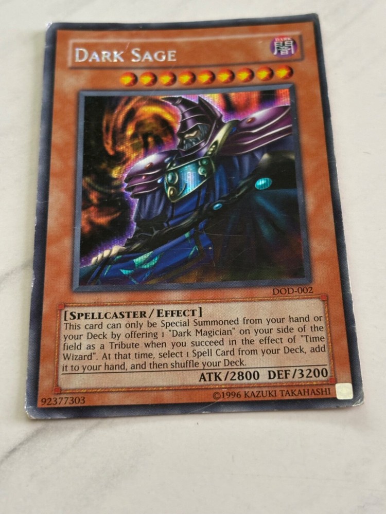 This Yu-Gi-Oh! TCG card is the perfect addition to any collection. With its Dark attribute and Secret Rare rarity, the Dark Sage card is a must-have for any Yu-Gi-Oh! player. The card features an Effect type and belongs to the Yu-Gi-Oh! The Dawn of Destiny Promotional Cards set. It has a card number of DOD-002 and is in a limited edition.The card is in great shape with no visible damage. Its Defense/Toughness is 3200 and its Attack/Power is 2800. This Spellcaster card is ideal for anyone who wants to add some extra magic to their game. Don't miss out on the chance to own this amazing card!