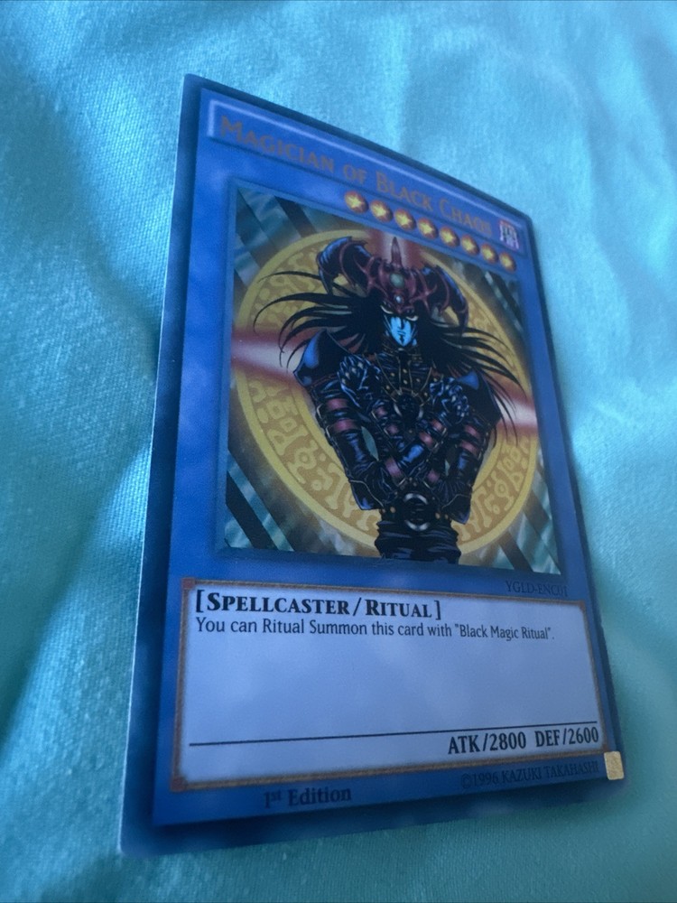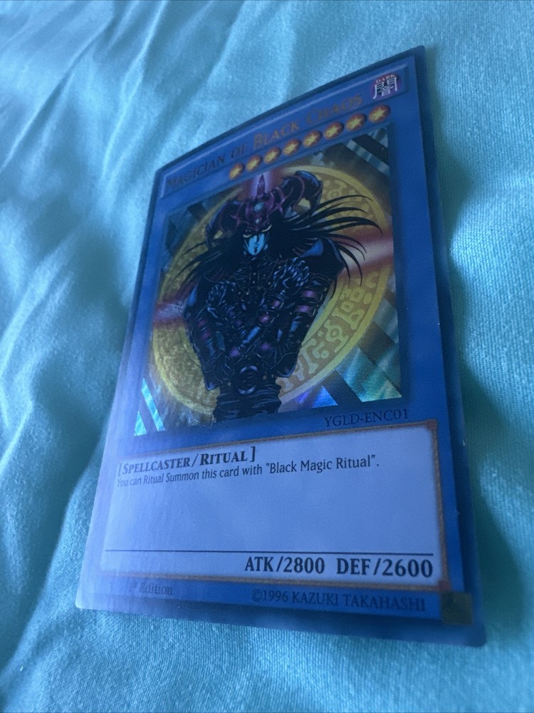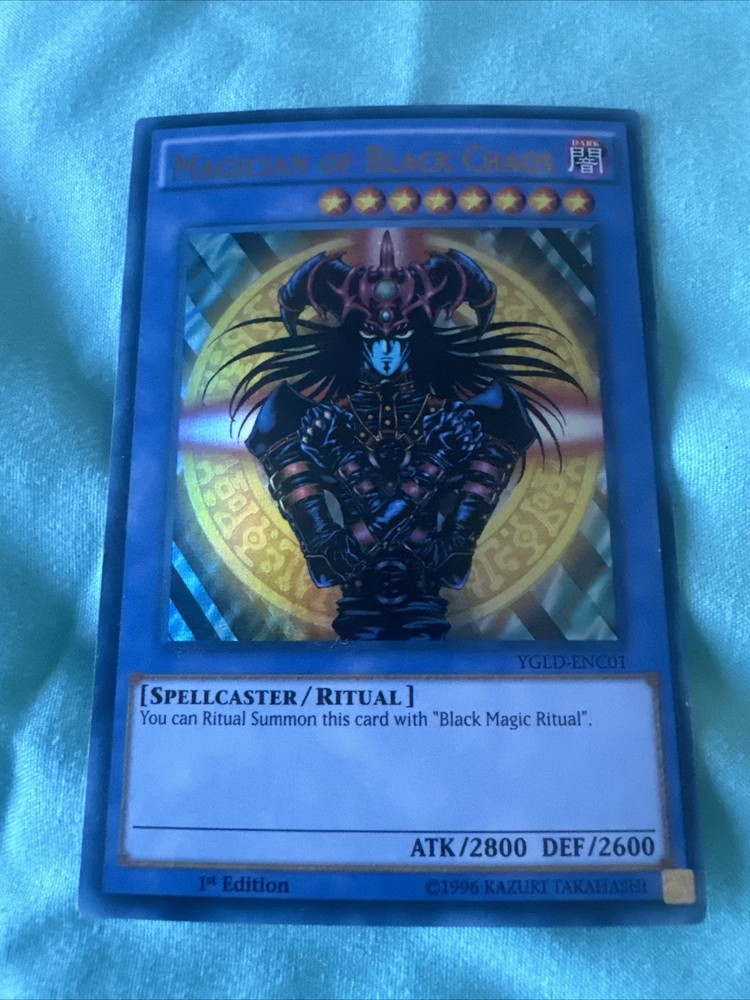 The Yu-Gi-Oh! TCG Magician of Black Chaos card is from the King of Games: Yugi's Legendary Decks set, featuring a Dark Spellcaster with 2800 Attack and 2600 Defense points. This Ultra Rare card is a 1st Edition Ritual Monster made of durable card stock material, manufactured by Konami in 1996. It is a sought-after vintage collectible in English language, with a holo finish, perfect for fans and collectors of the Yu-Gi-Oh! Trading Card Game.