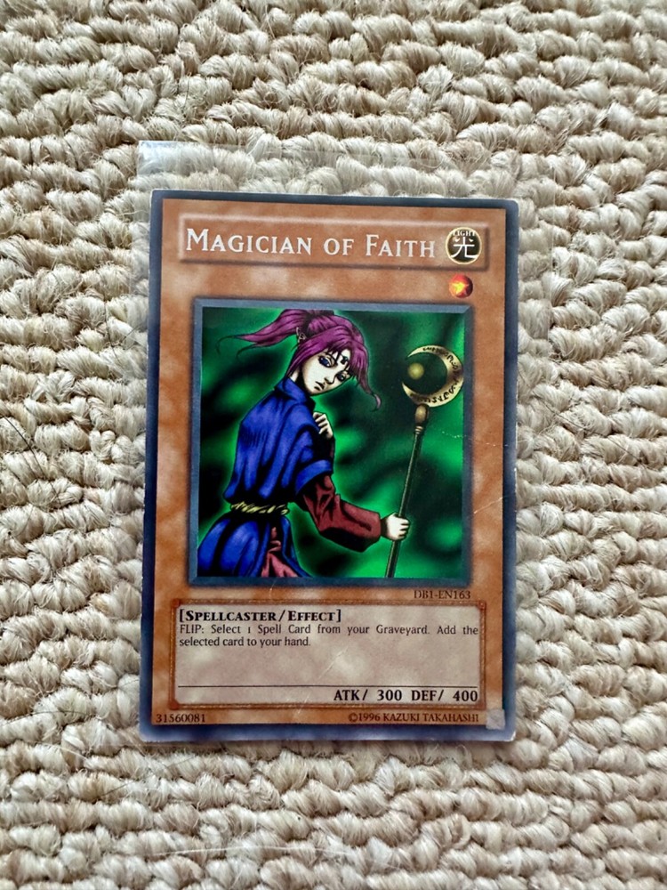 This Yu-Gi-Oh! TCG card is a rare find from the Dark Beginning 1 set. The Magician of Faith card features a Spellcaster creature type with an Attack/Power of 300 and Defense/Toughness of 400. It is an Unlimited edition with Card Number DB1-EN163, and belongs to the Effect card type. The card name is Magician of Faith, and it is colored Light. This collectible card game item is perfect for fans of the Yu-Gi-Oh! TCG game. The card is in great shape, with a Card Condition of 400016. It is a great addition to any collection, and is sure to impress. Don't miss out on the chance to own this rare card.