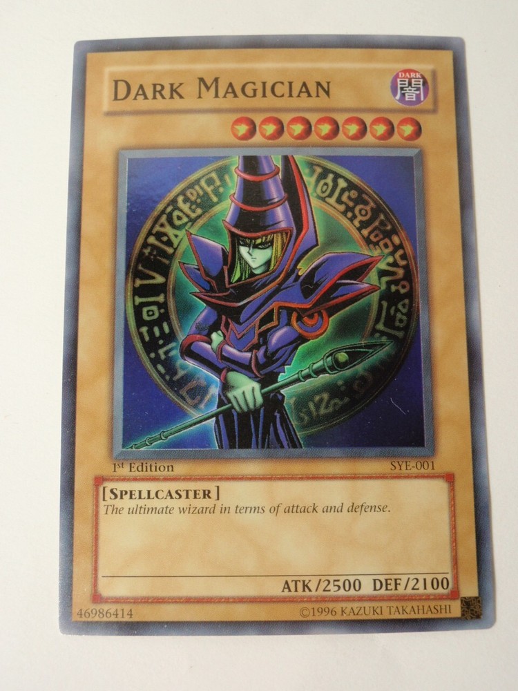 For auction is a Yugioh 1 st edition SYE-001 “Dark Magician” super rare card. The card is in USED condition and has damage. There is damage along the edges/corners, scratches, light surface stains and overall wear. Thank You and Happy Bidding~