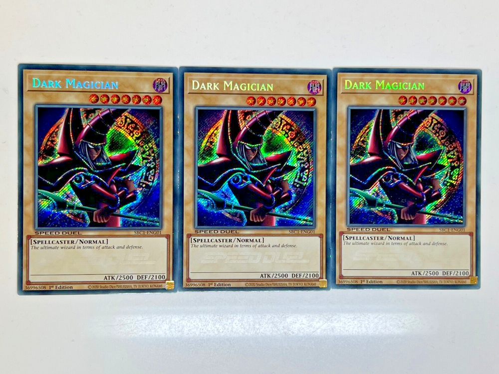 Welcome to HuzTCG ! You are bidding on the following Yugioh PRODUCT (Note all prices are the best on eBay and all cards are brand new booster fresh and in English unless stated): 3x Dark Magician - SBC1-ENG01 - Secret Rare - 1st Edition Shipping: All cards will be dispatched within a sleeve and sent in padded packaging within 1-2 working days after purchase is completed. All orders will be sent via Royal Mail and free shipping is offered to all UK customers. About us: We are a fast growing, trusted company made from players/collectors and gaming enthusiasts just like all of you! You can rest assured that we have a passion for all things cards and game related and our passion translates into the service we want to provide. Have peace of mind that we will do everything we can to be a brand you can trust! Our Service Promise: We aim to provide 5* service to all our customers and if you feel for any reason you we have fell short on this, then contact us and we will do our best to rectify this. All cards are in NM condition or better.