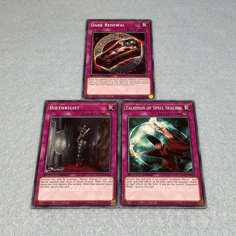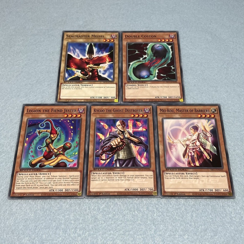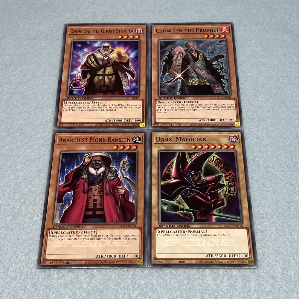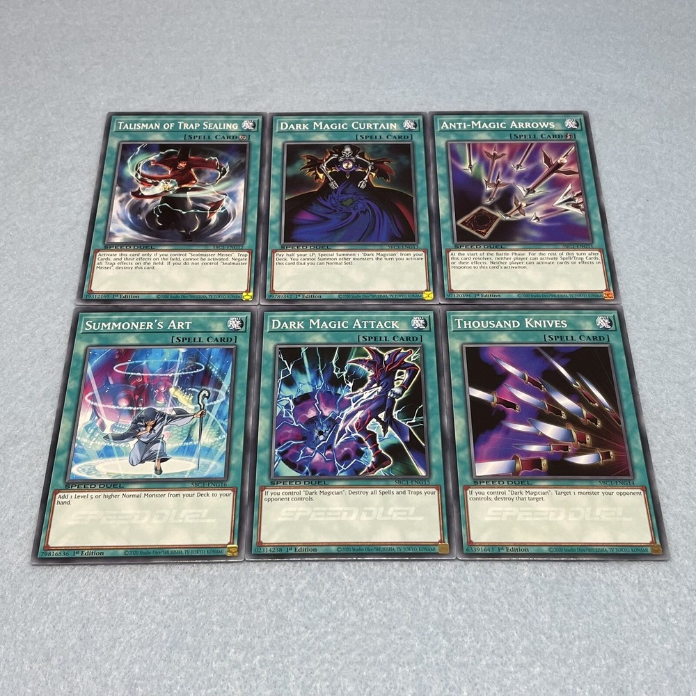 You will receive all of the cards listed. All cards are in near-mint condition 3 Dark Magician (Arkana) 3 Chow Sai the Ghost Stopper 3 Chow Len the Prophet 3 Anarchist Monk Ranshin 3 Mei-Kou, Master of Barriers 3 Kycoo the Ghost Destroyer 3 Legion the Fiend Jester 3 Double Coston 3 Sealmaster Meisei 3 Anti-Magic Arrows 3 Talisman of Trap Sealing 3 Dark Magic Curtain 3 Thousand Knives 3 Dark Magic Attack 3 Summoner's Art 3 Talisman of Spell Sealing 3 Birthright 3 Dark Renewal All cards are Speed Duel edition, and can be used in any Yu-Gi-Oh play format (including non-Speed Duel formats).