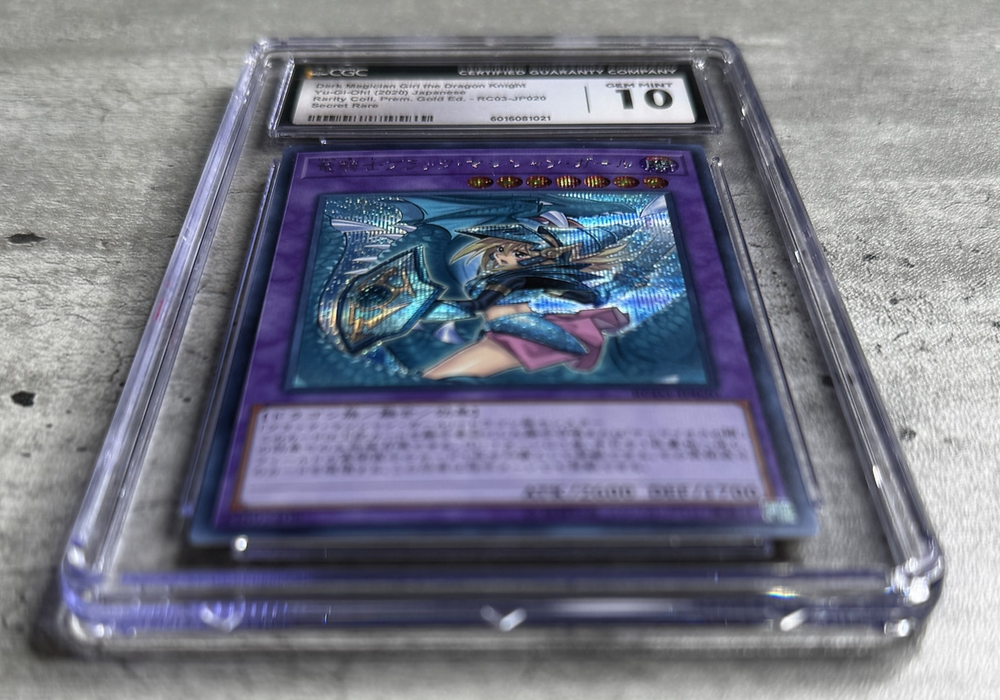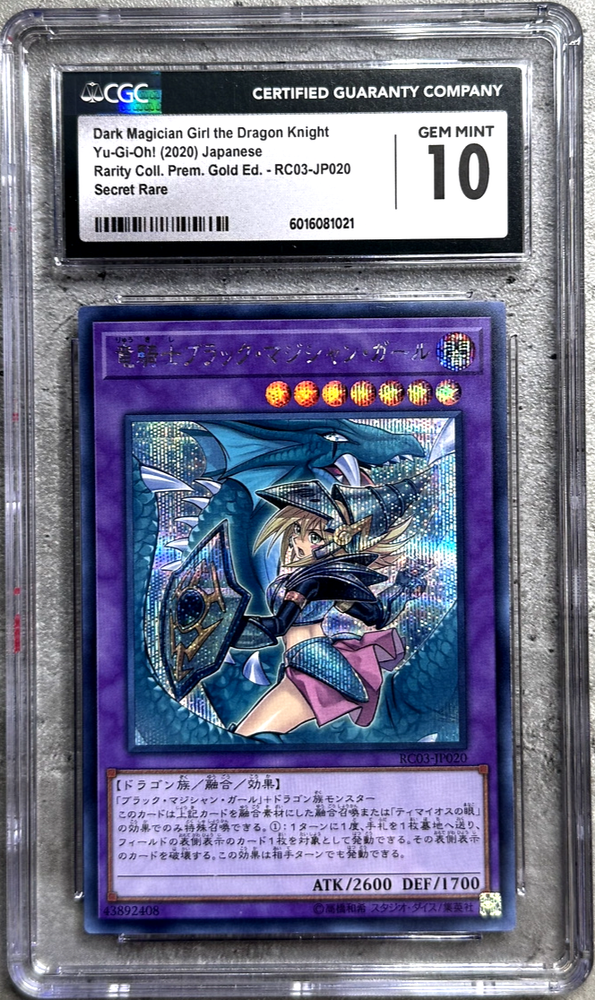 The card will come securely wrapped and packaged. A protective sleeve will come placed over the card’s case for added protection. The Yugioh Card JPN Dark Magician Girl The Dragon Knight SR CGC 10, RC03-JP020 2020 is a highly sought-after collectible card for fans of the Yu-Gi-Oh! TCG. This Secret Rare card features the iconic character Dark Magician Girl in her Dragon Knight form, manufactured by Konami. The card is a Fusion type with a Holo finish, making it a rare and valuable addition to any card collection. Its rarity and pristine CGC 10 grading make it a treasured item for collectors and players alike.