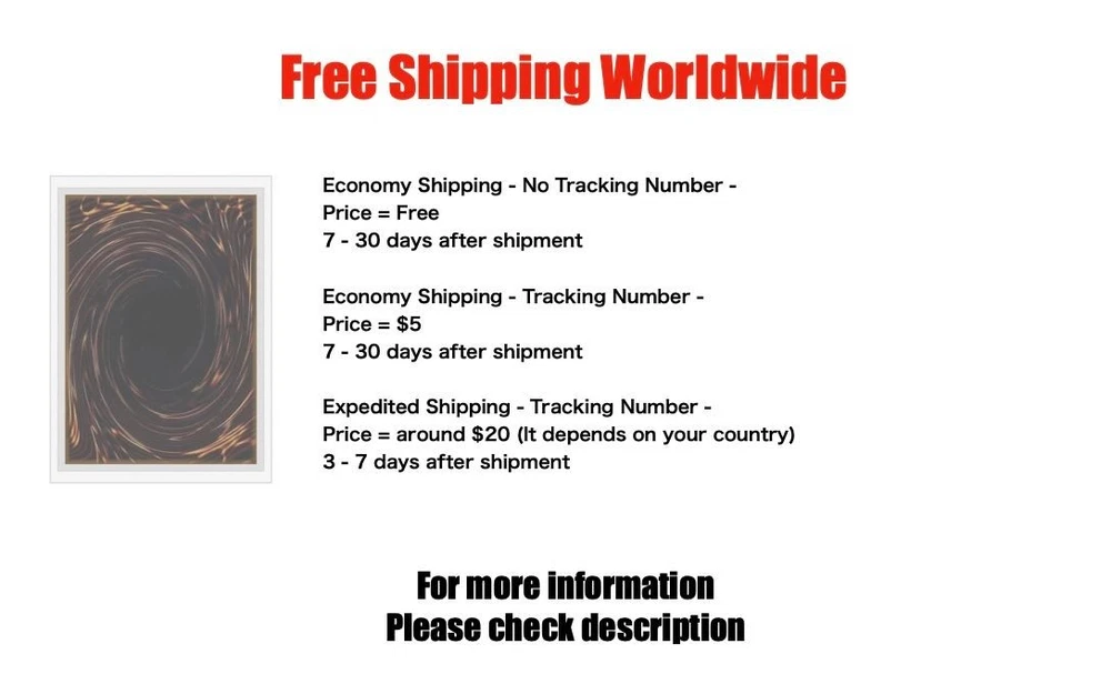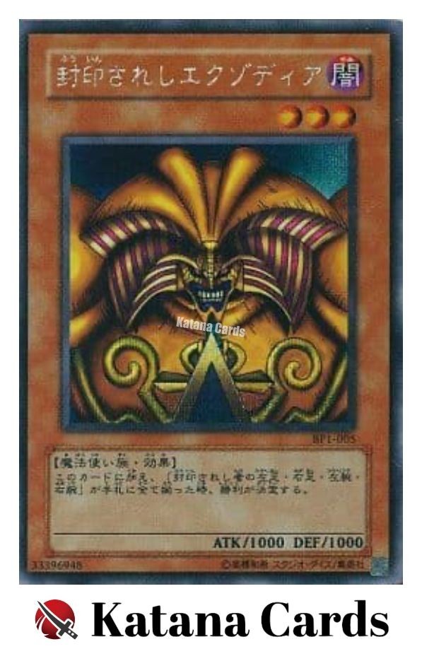 Yugioh Cards | Exodia the Forbidden One Secret Rare | BP1-005 Japanese C ondition Near Mint to Excellent Yugioh Cards Check our Yugioh cards here. D iscounts!!! Buy more than 2 cards in my store, Save 3 - 5% off for each cards. Yugioh Cards Check our Yugioh cards here. Discounts are applied automatically by simply adding the product to your cart! If the discount is not applied automatically due to eBay's system error, please inform us of the "Discount Error" in the message after purchasing the item. We will manually apply the discount based on the number of items purchased. S hipping We usually ship within 3 - 5 business days of receiving cleared payment. Economy Shipping - No Tracking Number - It takes 7 - 30 days after shipment. Expedited Shipping - Tracking Number - It takes 3 - 10 days after shipment. If you buy more than 2 cards and choose Expedited Shipping, please select Expedited Shipping for just 1 item. We will ship the items in one package. P ayment We can be contacted at any time through eBay messages if you have any questions, comments or product requests. We will respond to you within 24 hours and do our best to help you out! We encourage our customers to contact us with any questions or concerns! We'd like to be sure you are completely satisfied with your purchase. We do not mark merchandise values below value or mark items as gifts. US and International government regulations prohibit such behavior. I nternational Buyers - Please Note Import duties, taxes, and charges are not included in the item price or shipping cost. These charges are the buyers responsibility. Please check with your country's customs office to determine what these additional costs will be prior to bidding or buying.