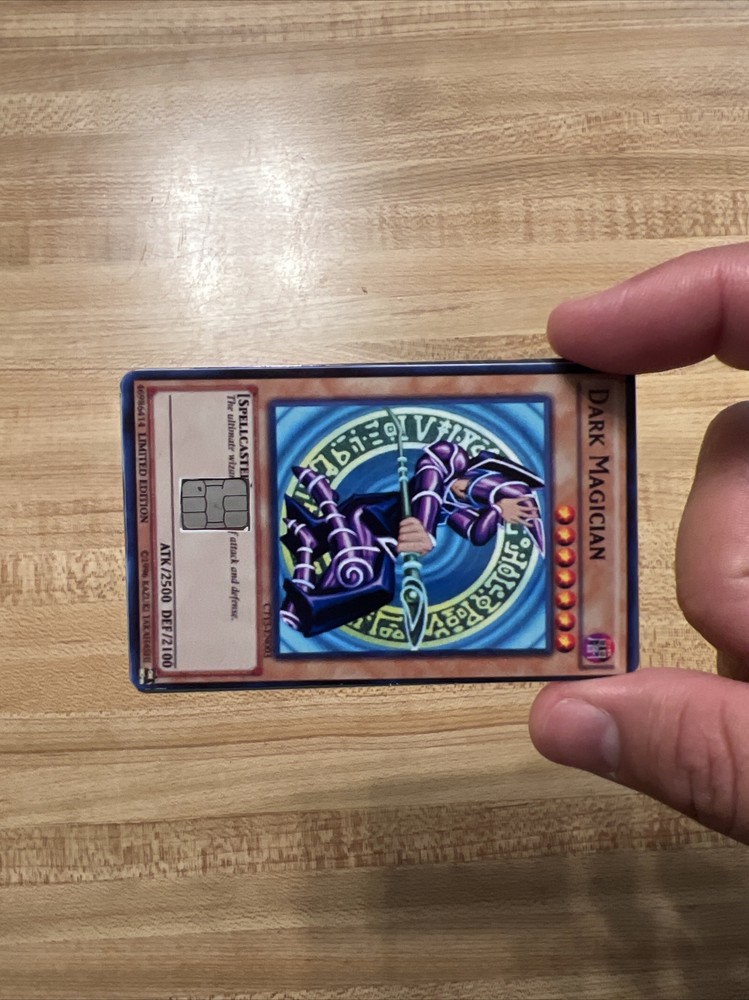 Yugioh Dark Magician Card - Credit Card Skin • Fits any debit/credit card • Package comes with 2 skins (Corners and Chip Hole silhouette must be cut by the buyer) • Feel free to ask for customs