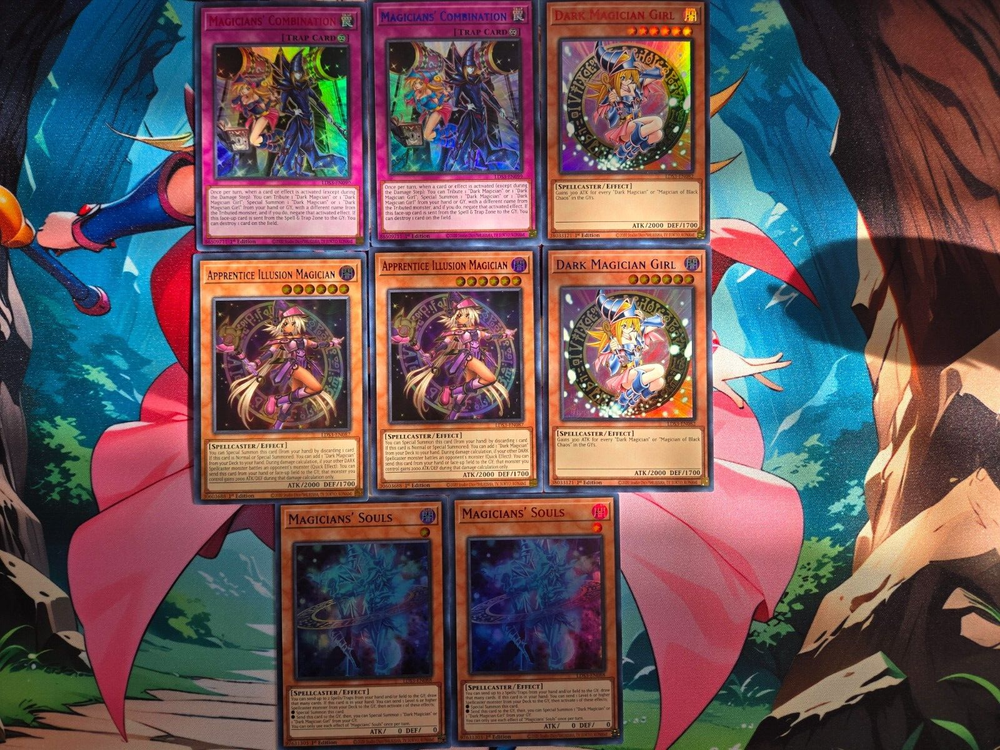 Up for auction is set of 8 Yugioh Dark Magician Girl, Apprentice Illusion Magician, Magicians' Souls and Magician's Combination LDS3 colored cards in near mint to lightly played condition. You will receive 1 copy each of blue and red named cards. The cards will be shipped in a plastic sleeve and toploader for added security. All sales are final for this listing. Sorry, no international shipping. Buy with confidence and thank you for looking.