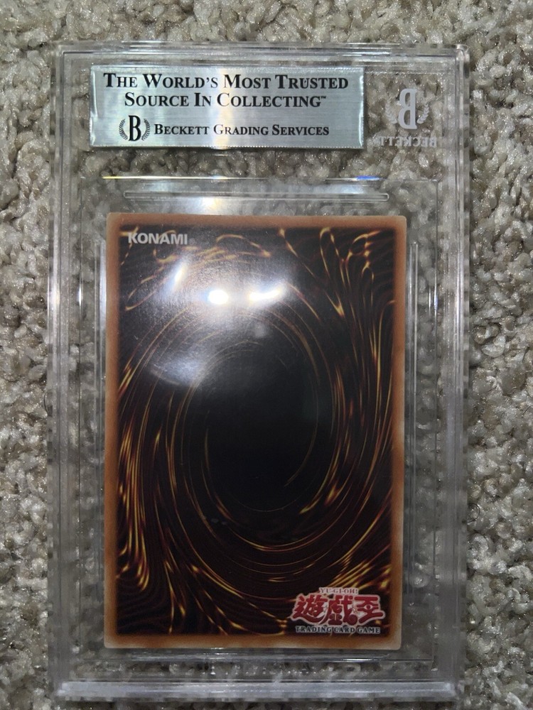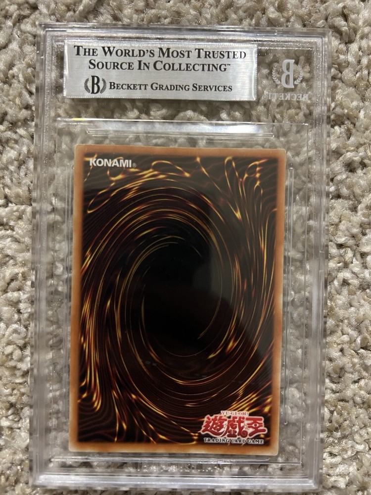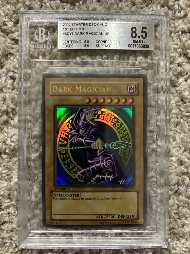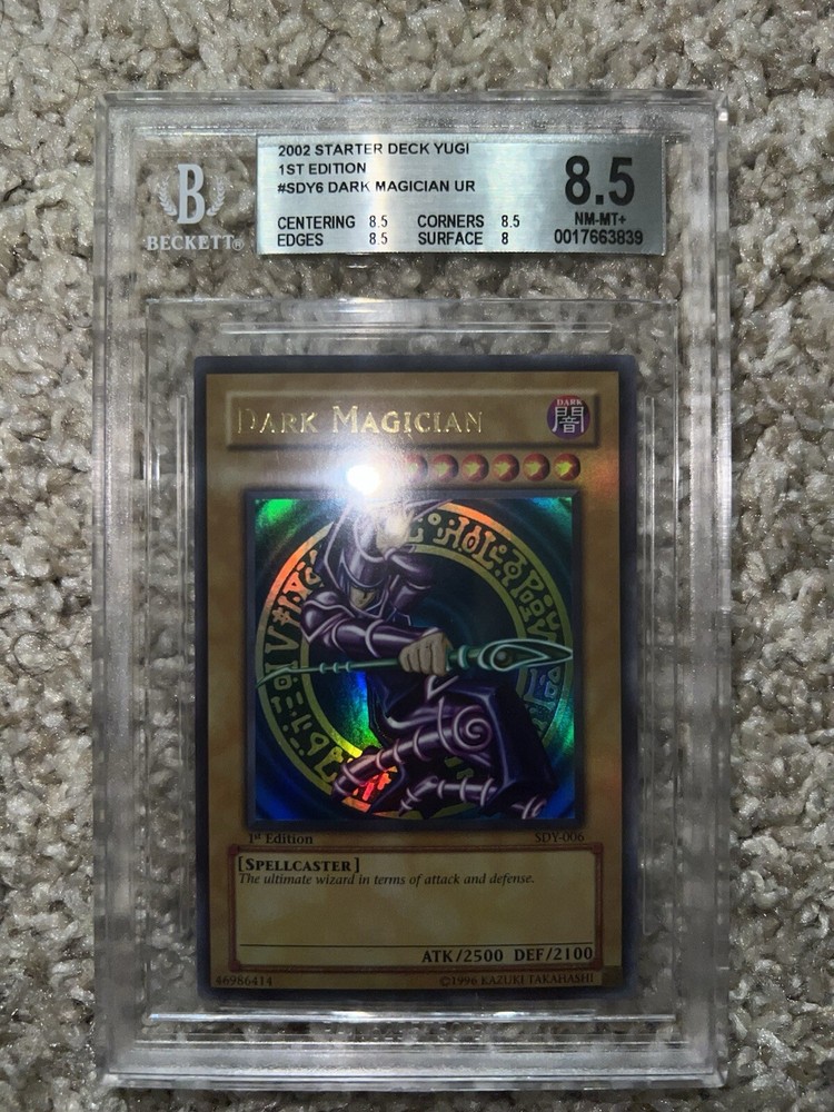Yugioh Dark Magician SDY-006 Ultra Rare 1st Edition BGS 8.5 is a graded Yu-Gi-Oh! TCG card featuring Yugi Muto's Dark Magician, a Spellcaster creature with a Darkness attribute. The card has a Holo finish and is classified as Ultra Rare. It was professionally graded by Beckett Collectors Club Grading (BCCG) with a grade of 8.5.