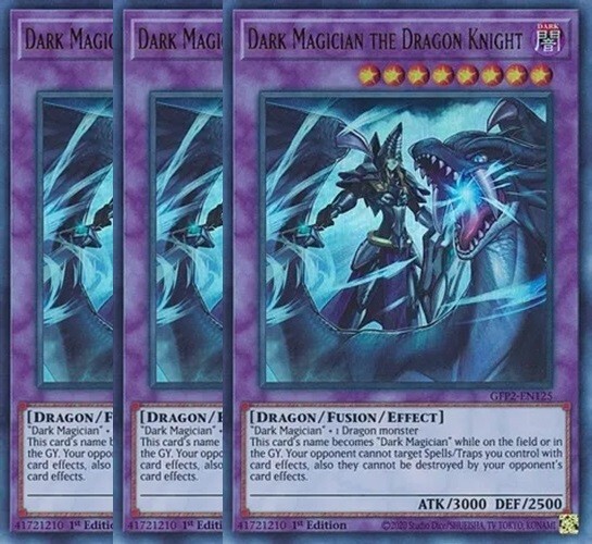 Dark Magician the Dragon Knight x 3 1st Edition - Ultra Rare The cards are in NM condition. Also will include a free Holographic card which can be a rarity of Super, Ultra, Secret, etc! Card Information "Dark Magician" + 1 Dragon monster This card's name becomes "Dark Magician" while on the field or in the GY. Your opponent cannot target Spells/Traps you control with card effects, also they cannot be destroyed by your opponent's card effects. Number: GFP2-EN125 Rarity: Ultra Rare