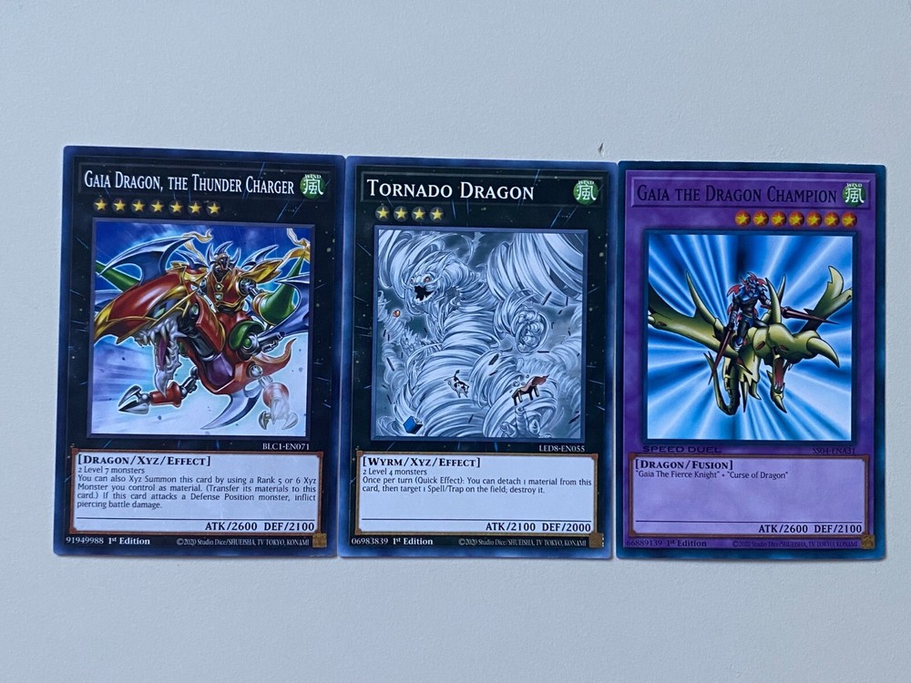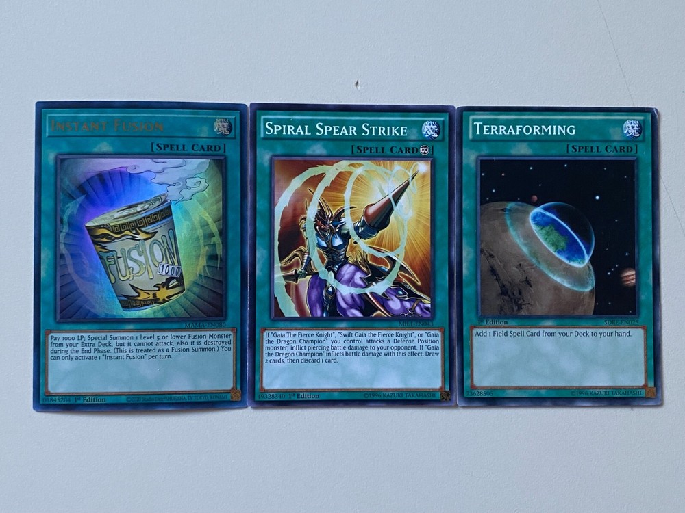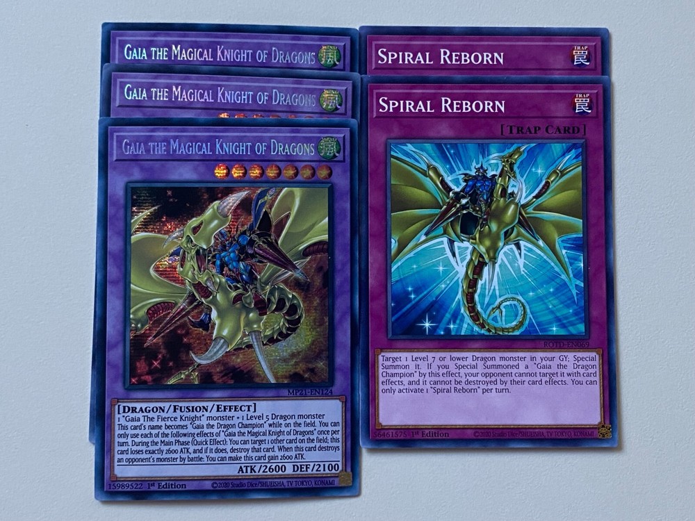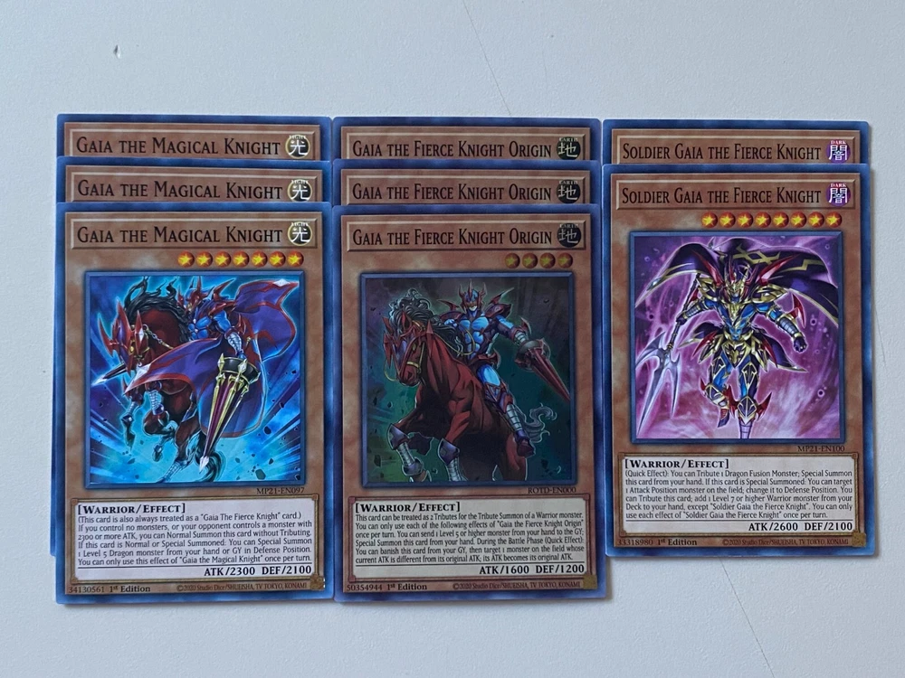Gaia Deck 55 Cards The cards are in NM condition unless stated otherwise. All cards are authentic and will be 1st, unlimited or limited edition cards. Each card will be sleeved. Also will include a Free Sealed Booster Pack! Deck Information Monsters 3x Artillery Catapult Turtle - Super Rare 3x Curse of Dragon, The Cursed Dragon 1x Curse of Dragonfire - Rare (Lightly Played) 1x Dark Magician 3x Gaia the Fierce Knight Origin - Super Rare 3x Gaia the Magical Knight 3x Keeper of Dragon Magic 2x Soldier Gaia the Fierce Knight Spells 1x Dragon Shrine - Rare (Lightly Played) 1x Dragon's Mirror - Rare 3x Galloping Gaia 1x Gateway to Chaos - Secret Rare 1x Instant Fusion - Ultra Rare 1x Monster Reborn - Super Rare 1x Reinforcement of the Army - Rare 3x Spiral Fusion (2x Rare, 1x Common) 1x Spiral Spear Strike (Lightly Played) 3x Summoner's Art 1x Terraforming (Lightly Played) Traps 1x Call of the Haunted - Rare 1x Metaverse - Rare 1x Spiral Discharge 2x Spiral Reborn Extras 1x Curse of Dragon, the Magical Knight Dragon - Super Rare 1x Dark Magician the Knight of Dragon Magic - Secret Rare 1x Dark Magician the Dragon Knight - Ultra Rare 1x Decode Talker - Ultra Rare 1x Gaia Dragon, the Thunder Charger 1x Gaia Saber, the Lightning Shadow - Ultra Rare 1x Gaia the Dragon Champion (Lightly Played) 3x Gaia the Magical Knight of Dragons (Prismatic Secret Rare)(Lighly Played) 1x Knightmare Phoenix - Rare 1x Knightmare Unicorn - Ultra Rare 1x Red-Eyes Flare Metal Dragon - Ultra Rare 1x Tornado Dragon