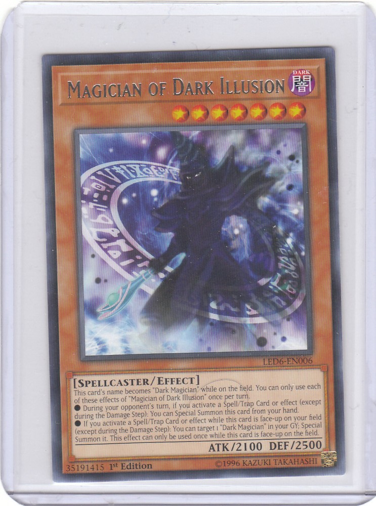 You are bidding on a Yugioh LED6-EN006 Magician of Dark Illusion – Rare 1st Edition. Card is mint condition. $1.25 shipping buy it now US buyers only. Combine shipping for US buyer please add $0.50 for each additional item won. $15.00 International shipping. Combine shipping for international buyer please add $2.00 for each additional item won.