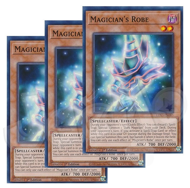 Magician's Robe x 3 1st Edition You will received 3 cards are they are in LP (Lightly Played) condition. Also will include a free Holographic card which can be a rarity of Super, Ultra, Secret, etc! Card Information During your opponent's turn (Quick Effect): You can discard 1 Spell/Trap; Special Summon 1 "Dark Magician" from your Deck. During your opponent's turn, if you activate a Spell/Trap Card or effect while this card is in your GY (except during the Damage Step): You can Special Summon this card, but banish it when it leaves the field. You can only use each effect of "Magician's Robe" once per turn. Number: LDS3-EN085 Rarity: Common