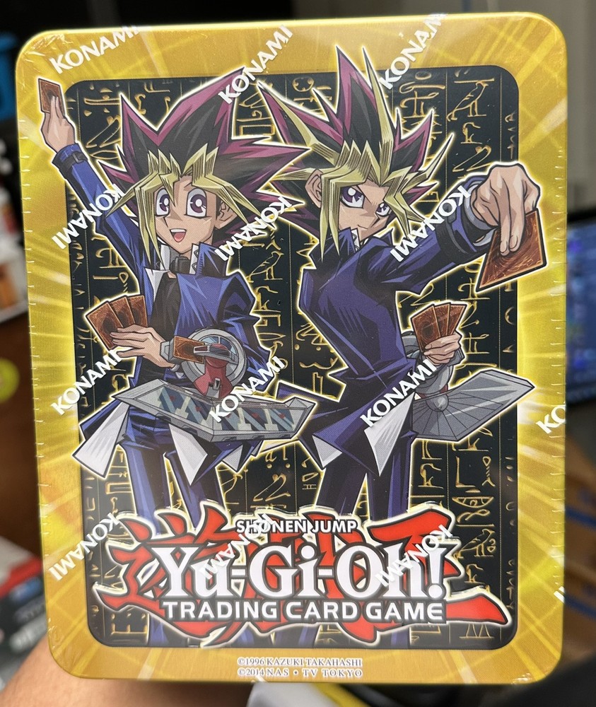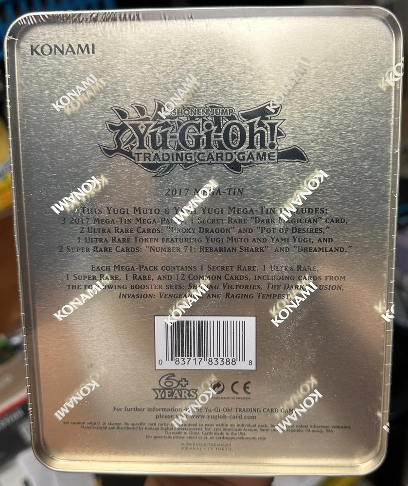 The product is a Yu-Gi-Oh! Trading Card Game item, specifically the 2017 Mega Tin featuring characters Yugi Muto and Yami Yugi. Manufactured by Konami, this pack includes cards related to the Dark Magician character from the Yugioh series. The Mega Tin is new and sealed, making it a sought-after collectible for fans of the franchise.