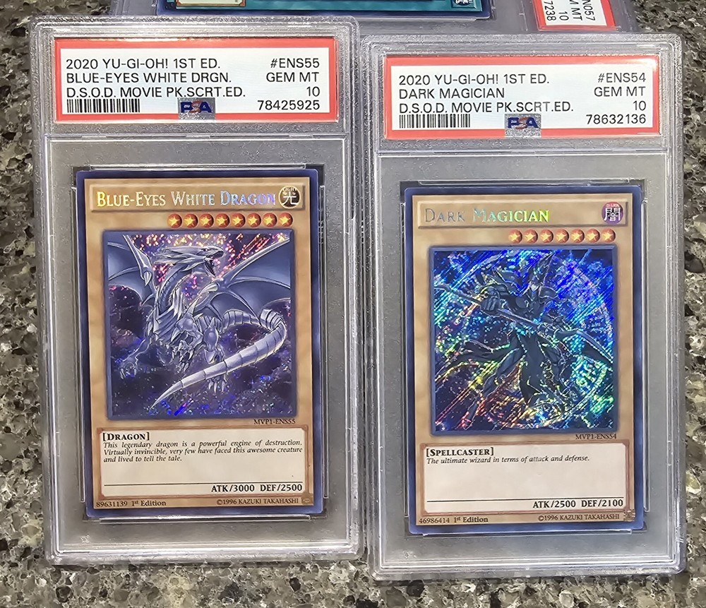 Yugioh Movie Pack Secret Editions, Dark Magician And Blue Eyes White Dragon PSA. Condition is Graded. Shipped with USPS Ground Advantage....