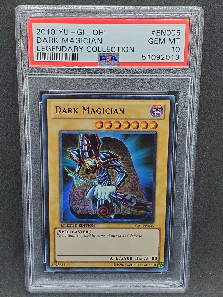 You are bidding on a Yugioh PSA 10 GEM MINT Dark Magician Ultra Rare Card# LC01-EN005 from Legendary Collection 1 !!! This card has been graded as GEM MINT - a perfect 10 - by PSA!!! An incredible addition to any collection! Shipping is FREE on this item in the United States! Do note that multiple PSA 10 graded copies of this card are available; the specific PSA Certification Number you get may vary slightly from the one in the photo. All cards will be shipped in sleeves, Top Loaders (or similar), and a padded envelope or appropriately sized padded box for safe arrival. In this case, the PSA-cased card will be in a graded card sleeve as well. For orders over $250, please be advised that signature confirmation is required. Please allow 2-3 business days handling time. Make sure to check out our other listings for all of your favorite Trading Card Games! Thanks for shopping at Yeti Gaming!