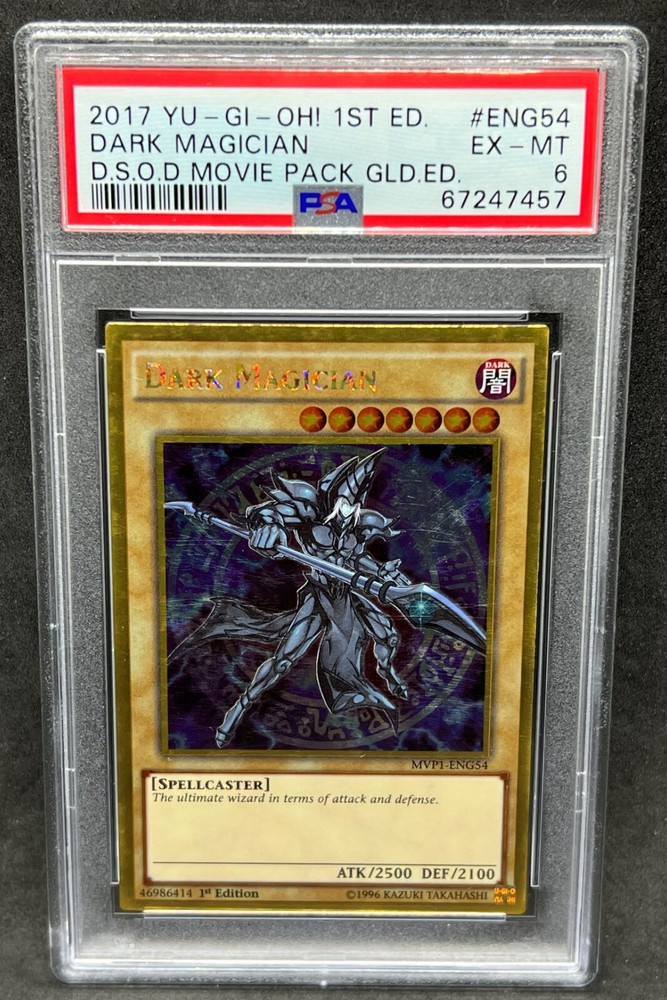 You are bidding on a Yugioh PSA 6 EX-MT Dark Magician MVP1-ENG54 Gold Rare 1st Edition!! This card has been graded as EX-MT - a 6 - by PSA!!! An excellent addition to any collection! Shipping is FREE on this item in the United States! All PSA cards will be shipped in a padded envelope or appropriately sized padded box, with a graded card sleeve surrounding the PSA Case. For orders over $250, please be advised that signature confirmation is required. For any questions regarding shipping or otherwise, please contact us prior to purchase. Please allow 2-3 business days handling time. Make sure to check out our other listings for all of your favorite Trading Card Games! Thanks for shopping at Yeti Gaming!