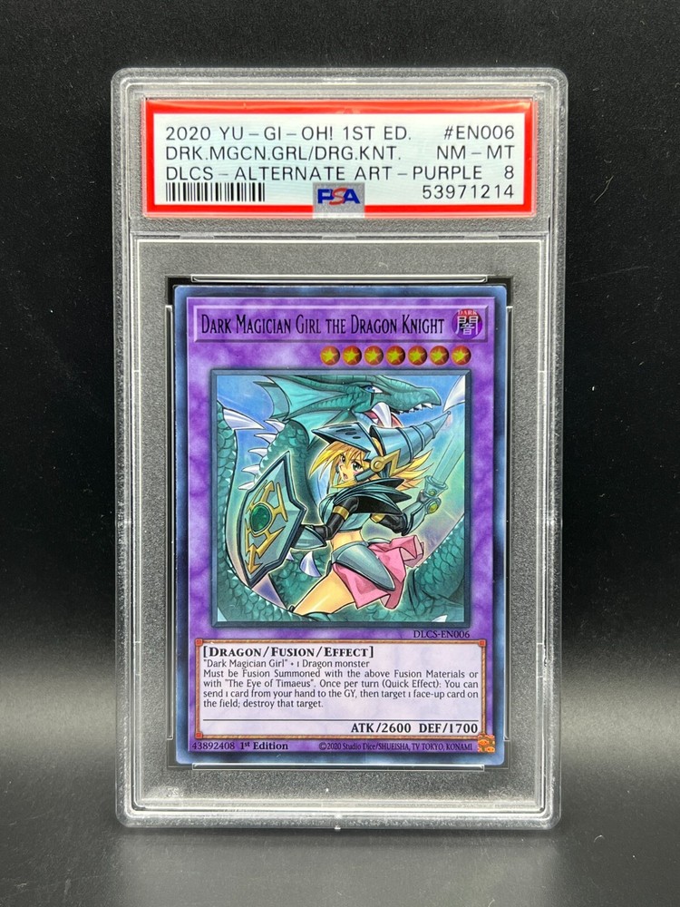You are bidding on a Yugioh PSA 8 NM-MT Dark Magician Girl the Dragon Knight DLCS-EN006 Ultra Rare (Purple) Alternate Art 1st Edition from Dragons Legend the Complete Series !! This card has been graded as NM-MT - an 8 - by PSA!! An incredible addition to any collection! We are a US Seller! Shipping on all items is FREE inside the United States. For international orders we use eBay's Global Shipping Program. All shipping charges, taxes, fees, etc. for international orders are calculated and collected by eBay at checkout. You will receive the exact item pictured in the listing - for more pictures or if you have any questions, don't hesitate to contact us! This card will be shipped in an appropriately sized padded double-box (where the padded box with the PSA card is shipped inside a second padded box), with a graded card sleeve surrounding the PSA Case. Due to the item's value, please be advised that signature confirmation is required. For any questions regarding shipping or otherwise, please contact us prior to purchase. Please allow 2-3 business days handling time. Make sure to check out our other listings for all of your favorite Trading Card Games! Thanks for shopping at Yeti Gaming!