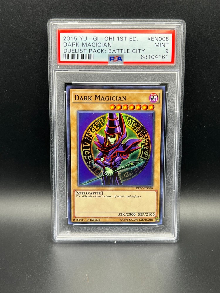 You are bidding on a Yugioh PSA 9 MINT Dark Magician DPBC-EN0085 Super Rare 1st Edition from Duelist Pack Battle City!! This card has been graded as MINT - a 9 - by PSA!!! A great addition to any collection! Shipping is FREE on this item in the United States! All PSA cards will be shipped in a padded envelope or appropriately sized padded box, with a graded card sleeve surrounding the PSA Case. For orders over $250, please be advised that signature confirmation is required. For any questions regarding shipping or otherwise, please contact us prior to purchase. Please allow 2-3 business days handling time. Make sure to check out our other listings for all of your favorite Trading Card Games! Thanks for shopping at Yeti Gaming!