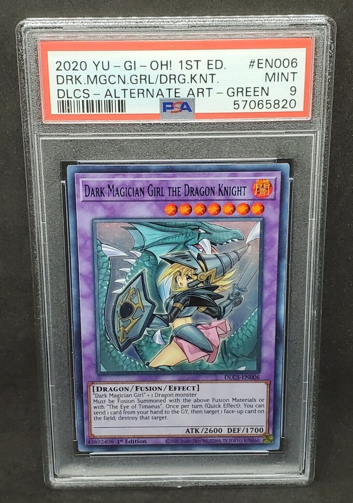 You are bidding on a Yugioh PSA 9 MINT Dark Magician Girl the Dragon Knight (Green) Alternate Art 1st Edition Card# DLCS-EN006 from Dragons of Legend: The Complete Series !!! This card has been graded as MINT - a 9 - by PSA!!! An incredible addition to any collection! Do note that multiple PSA 9 graded copies of this card are available; the specific PSA Certification Number you get may vary slightly from the one in the photo. Shipping is FREE on this item in the United States! All PSA cards will be shipped in a padded envelope or appropriately sized padded box, with a graded card sleeve surrounding the PSA Case. For orders over $250, please be advised that signature confirmation is required. For any questions regarding shipping or otherwise, please contact us prior to purchase. Please allow 2-3 business days handling time. Make sure to check out our other listings for all of your favorite Trading Card Games! Thanks for shopping at Yeti Gaming!