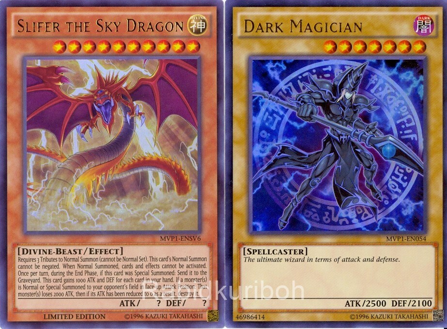 Selling what's listed below. Cards are in near mint or better condition unless specified below. The card(s) edition (1st, unlimited, limited) may be different from what is pictured. If this is important to you, please message me before buying so I can verify. Slifer the Sky Dragon - MVP1-ENGSV6 - Ultra Rare Dark Magician - MVP1-EN054 - Ultra Rare Shipping is by USPS. Cards are shipped safely in a top loader.