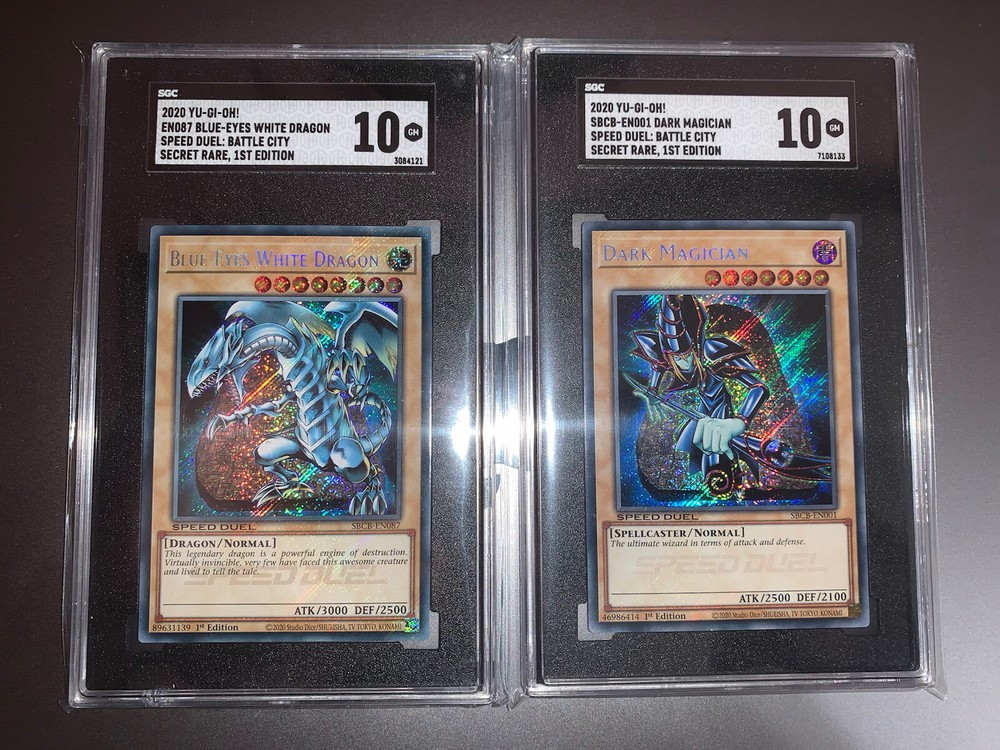 Speed Duel SBCB-EN001 Dark Magician SBCB-EN087 Blue-Eyes White Dragon Secret Rare 1st SGC 10 Gem Mint LOW POP PSA 10 equivalent. Card ships with loving handle and care. From 1 collector to the next. I use a sleeve, toploader, easy to pull out tab, easy to peel off folded tape. - Raw cards come attached to cardboard for support, nestled in a Beckett shield resealable sleeve to protect from water damage. - Graded cards come covered with bubble wrap, as well as the Beckett shield sleeve. All cards mailed in a bubble envelope. If you buy multiple cards I combine shipping, and love to offer discounts depending on how many items you want. Returning customers are always well taken care of. Ask questions Thank you.