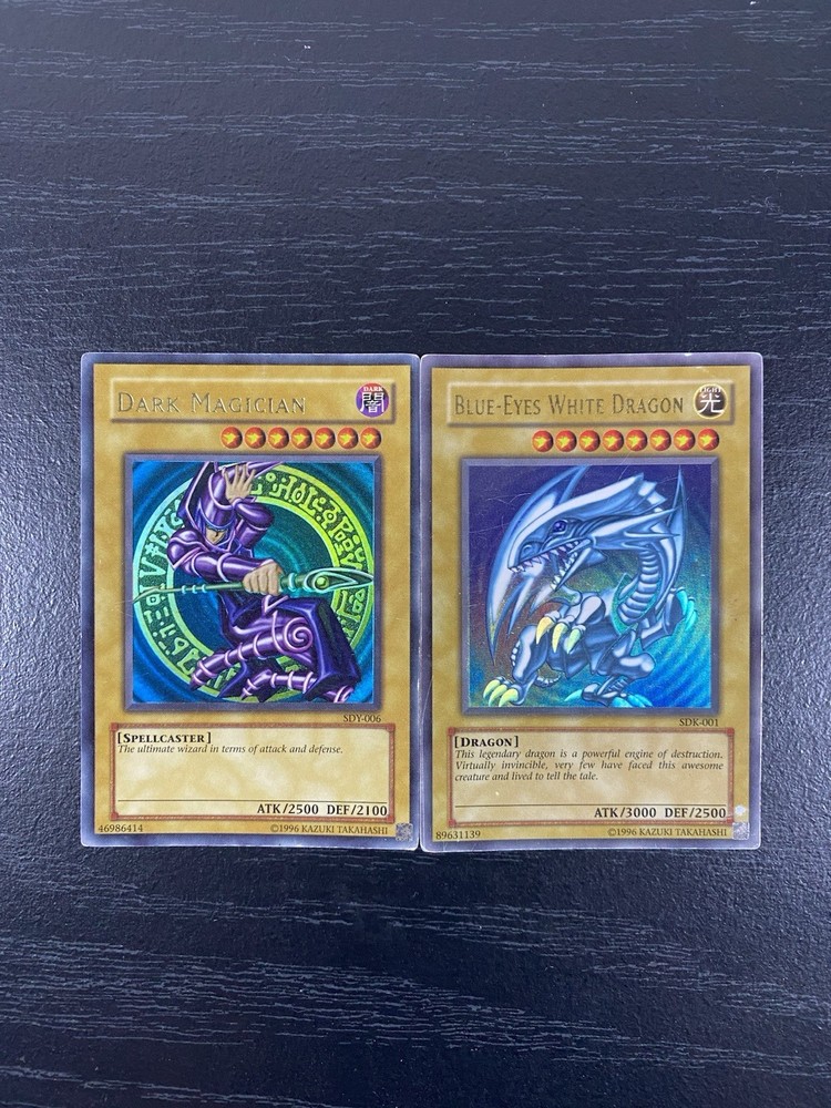 Dark magician sdk6 unlimited and blue eyes unlimited sdk1 unlimited in very played condition. The blue eyes has light written on the back