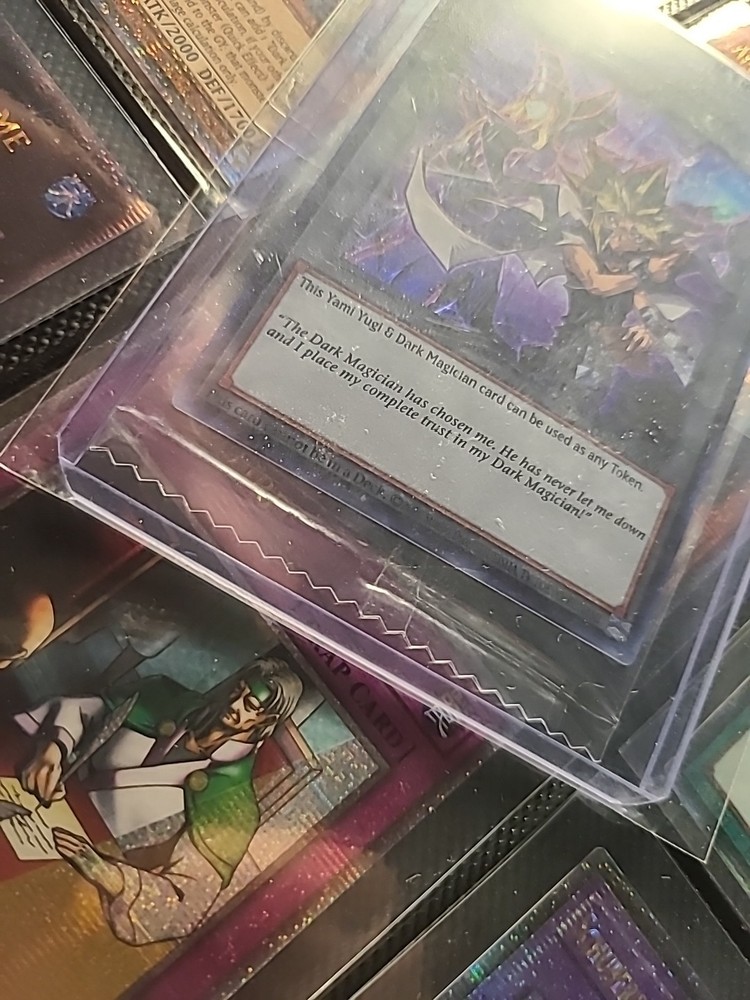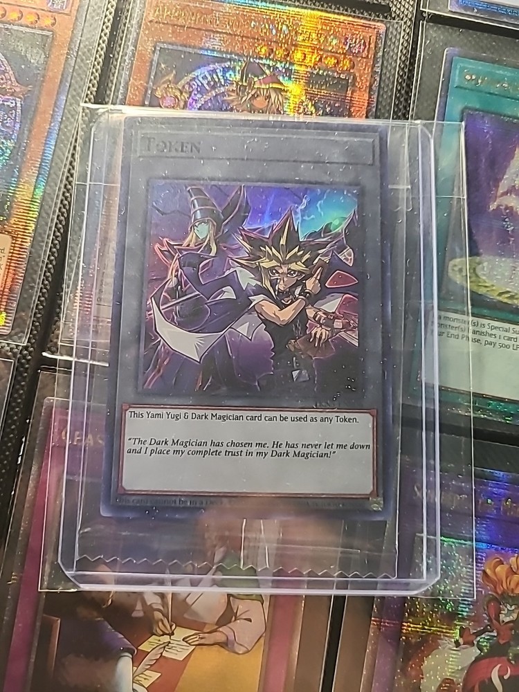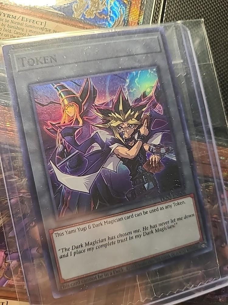 The product is a Yu-Gi-Oh! TKN5-EN006 Token featuring Yami Yugi & Dark Magician, a Super Rare card in near mint or better condition. This English language card has a Holo surface effect and is autographed by Konami, the manufacturer of the Yu-Gi-Oh! TCG. It is a special edition from The Infinite Forbidden set, making it a rare and sought-after collectible for fans of the game. The card showcases the iconic characters Yami Yugi and Dark Magician, reflecting the darkness attribute and unique features of the Yugioh Konami universe.