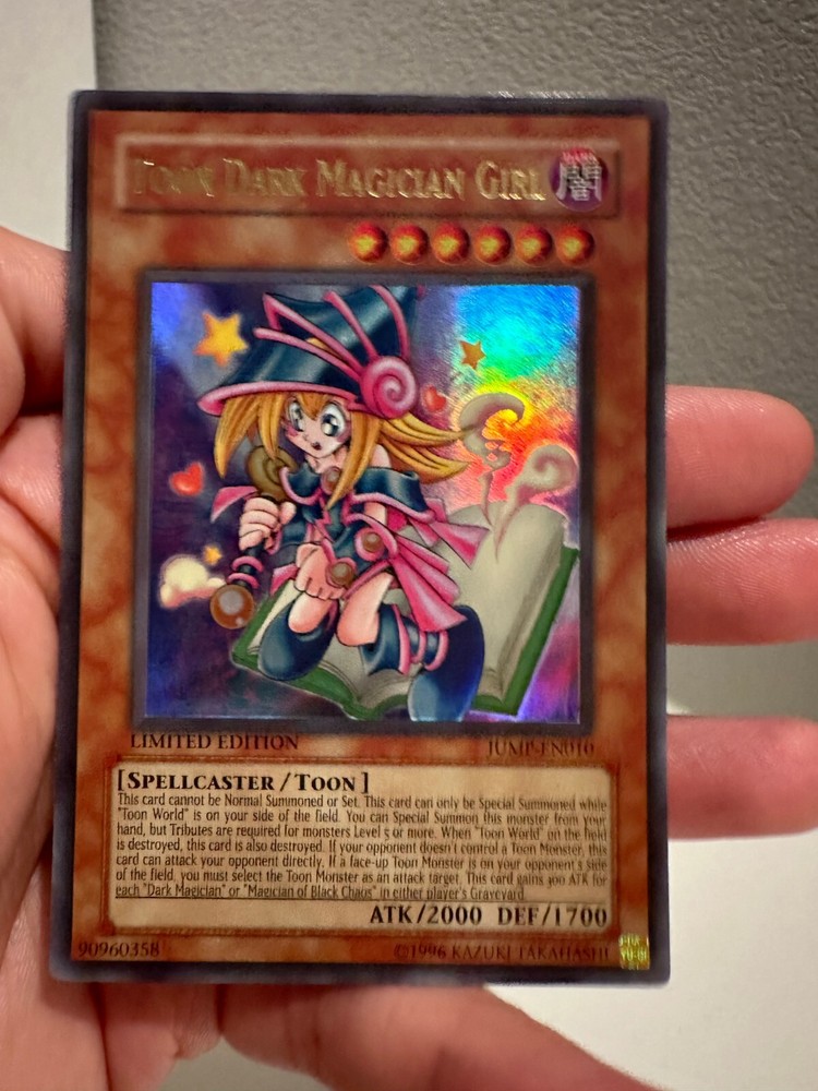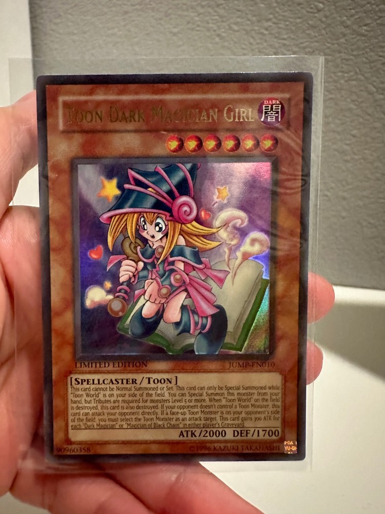 This Toon Dark Magician Girl card is in fantastic condition—clean edges, vibrant colors, and no visible flaws. The seller shipped it carefully in a top loader with a sleeve, ensuring it arrived safely. A must-have for collectors and duelists alike!