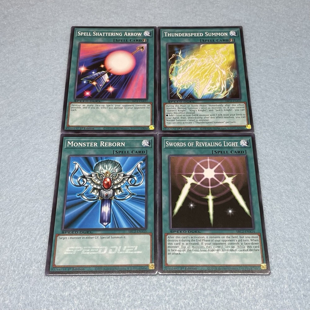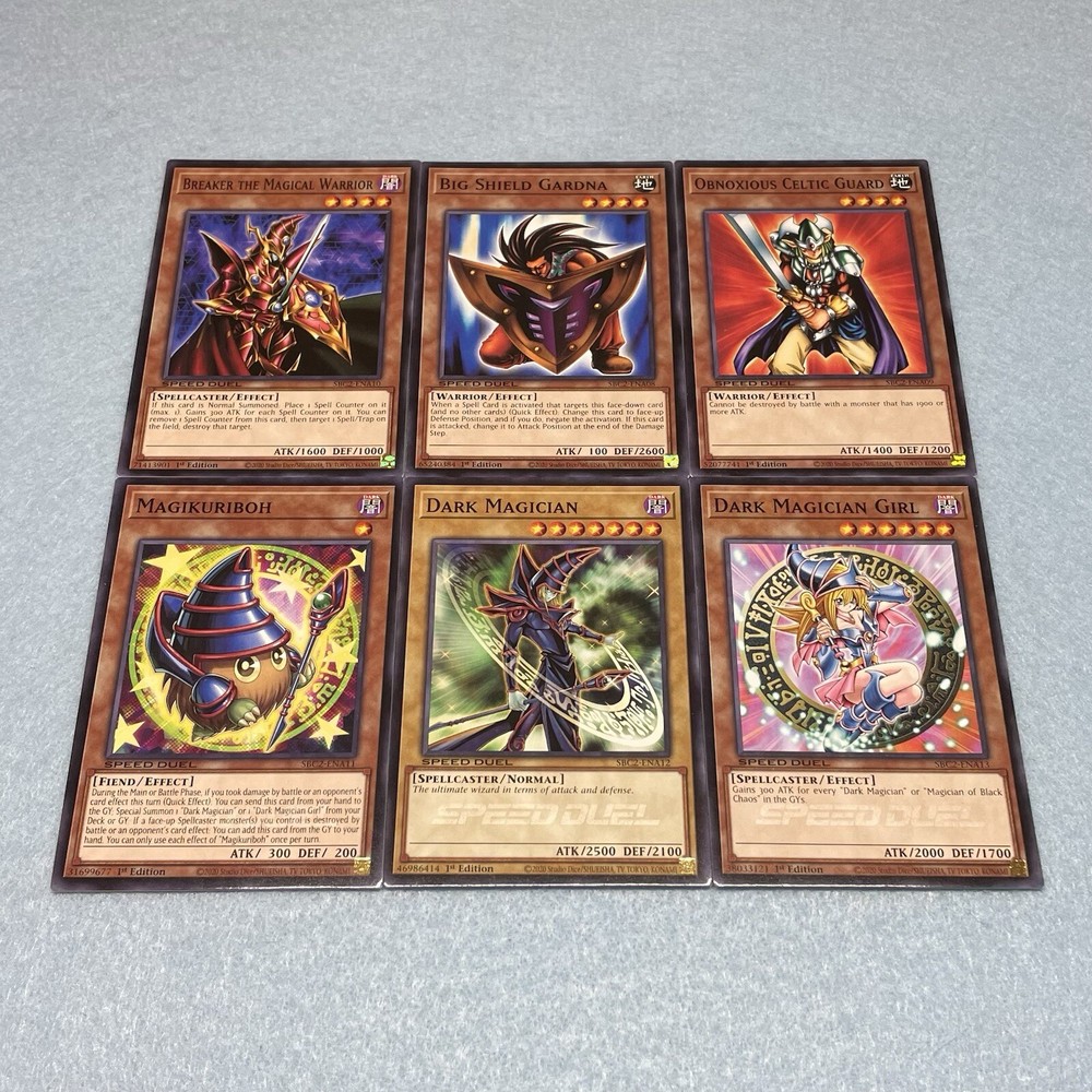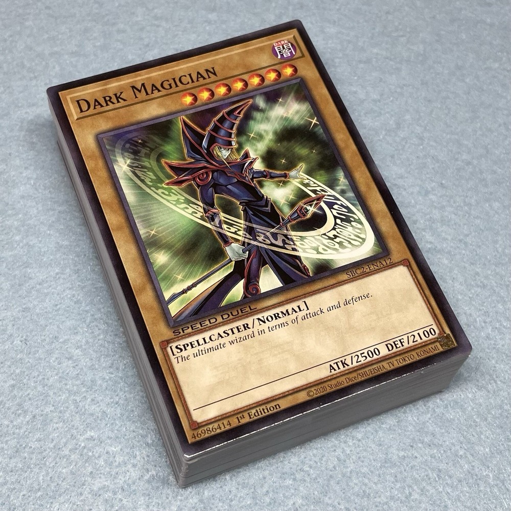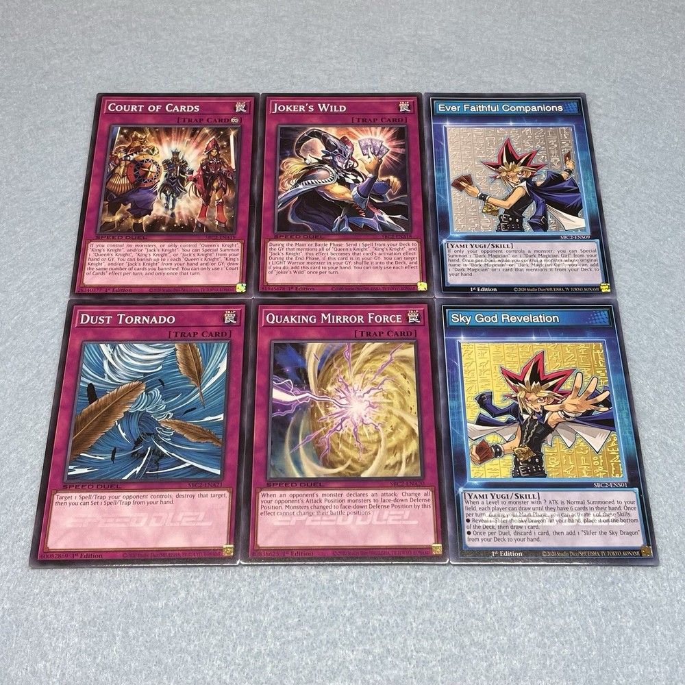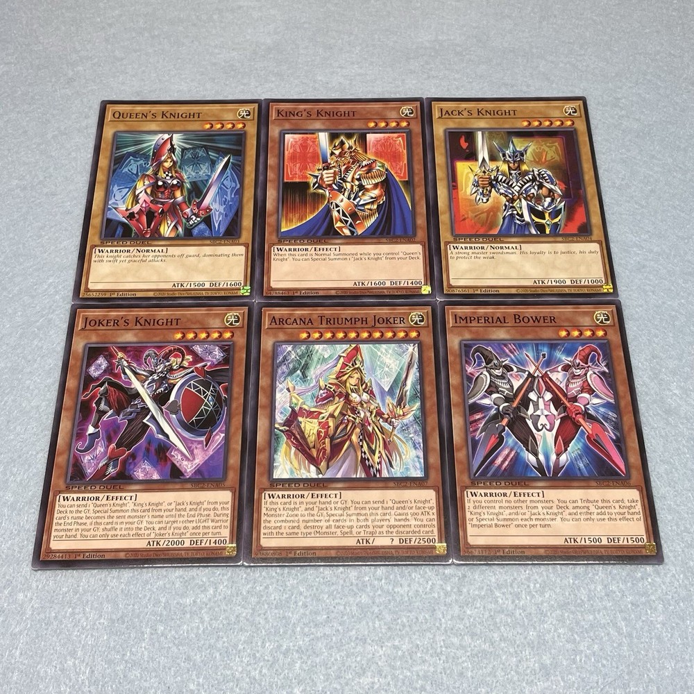 You will receive Yami Yugi’s 60-card Royal Knight + Dark Magician Deck, which was used in the final stages of Battle City. You will receive the following cards: Monsters (36): 3x King's Knight 3x Queen's Knight 3x Jack's Knight 3x Joker's Knight 3x Imperial Bower 3x Arcana Triumph Joker 3x Big Shield Gardna 3x Obnoxious Celtic Guard 3x Breaker the Magical Warrior 3x Magikuriboh 3x Dark Magician 3x Dark Magician Girl Spells (12): 3x Swords of Revealing Light 3x Monster Reborn 3x Thunderspeed Summon 3x Spell Shattering Arrow Traps (12): 3x Joker's Wild 3x Court of Cards 3x Quaking Mirror Force 3x Dust Tornado Skill Cards (2): 1x Sky God Revelation 1x Ever Faithful Companions All main deck cards are speed duel edition, and are permitted for use in ALL duel formats, including non speed duel formats. Skill cards are for speed duel format only.