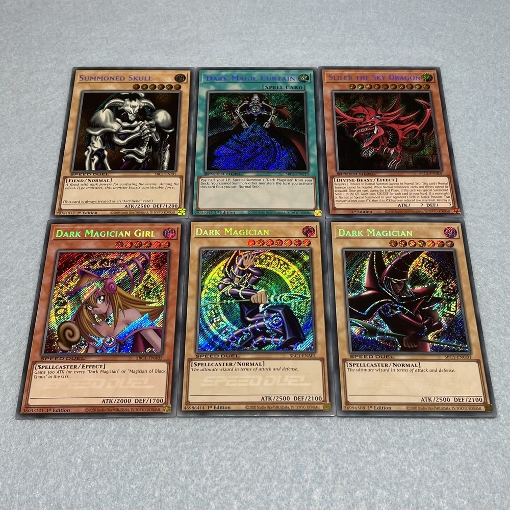 You will receive the following cards: 1x Dark Magician Girl (Secret Rare) 1x Dark Magician (Secret Rare) 1x Dark Magician (Arkana Alter Art, Secret Rare) 1x Summoned Skull (Secret Rare) 1x Slifer the Sky Dragon (Secret Rare) 1x Dark Magic Curtain (Secret Rare) Speed Duel cards may be used in all Yu-Gi-Oh TCG duel formats.