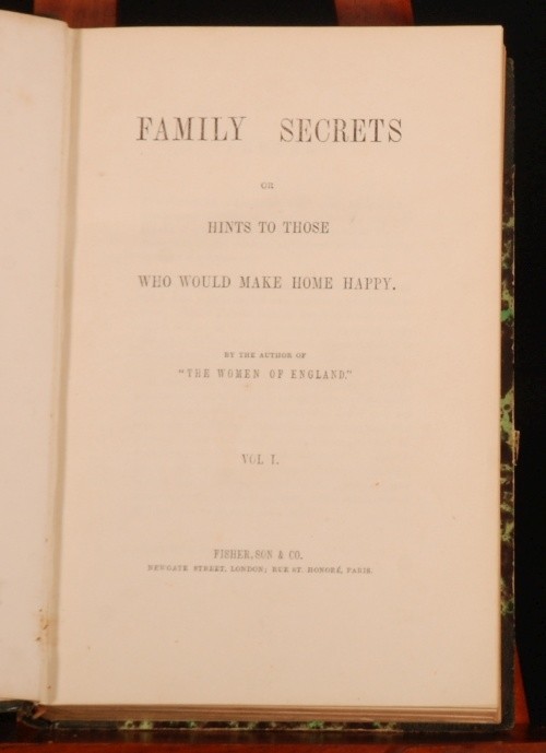 Click here to see our other books! Family Secrets, or, Hints to Those Who Would Make Home Happy Sarah Stickney Ellis c1843 Fisher, Son & Co : London 8.5" by 5.5" (3), 328; (2), 312; (2), 308pp SUMMARY Ellis' illustrated short stories on domesticity, complete in three volumes. Leather Binding Overall Condition: Very Good Indeed This book weighs 1.5 KG when packed UK Postage: £ 3.99 US Postage: £ 23.99 EU Postage : £ 18.99 European Postage: £ 19.99 Asia Postage: £ 31.99 Worldwide Postage: £ 32.99 DESCRIPTION Includes illustrated title pages in each volume, and a frontis in volumes I and II. With nine plates in both volumes I and II, and eight plates in volume III. Sarah Stickney Ellis (1799–1872) was a Quaker turned Congregationalist who was the author of numerous books, mostly written about women's role(s) in society. Particularly well-known are The Wives of England, The Women of England, The Mothers of England, and The Daughters of England, also her more directly educational works such as Rawdon House and Education of the Heart: Women's Best Work. CONDITION In half leather binding with gilt lettering and decoration, and marbled paper-covered boards. There is only slight wear to the extremities, with just slight bumping and rubbing. The front inner hinge of volume III is very slightly strained, but still good and firm. Internally, firmly bound. Pages are generally clean with slight browning to the page edges and scattered foxing to the plates. Overall Condition: Very Good Indeed GLOSSARY OF TERMS Overall Condition (Dustwrapper condition rating is shown after that for the book itself, where a dustwrapper is present) Fine - Very well preserved copy showing very little wear Very Good Indeed - Only one or two minor faults, really a very attractive copy Very Good - Quite a wide term meaning no major faults but probably several smaller ones often expected given the age of the book, but still a respectable copy Good - Meaning not very good. Some more serious faults as will be described in the condition report under 'condition' Good Only - Meaning one or more faults that could really do with repair Fair - As with good only above but with other faults leaving a compromised copy even after repair Poor - Really bad and possibly seriously incomplete. We only sell books in this condition where their rarity or value makes them attractive none the less. Major defects will be described. GUARANTEE We offer a full money back guarantee on our descriptions. Please ask for details and conditions. We prefer PAYPAL. If you pay via PAYPAL we will post the item off the same or the next working day with the postage you have selected. Please note we cannot accept USD cheques