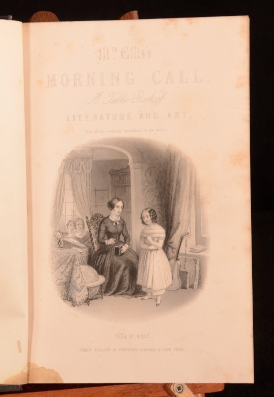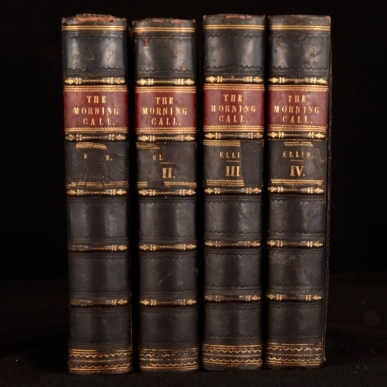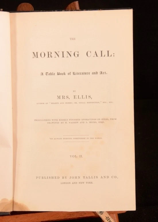 Click here to see our other books! The Morning Call A Table Book of Literature and Art Sarah Stickney Ellis c1850 John Tallis : London and New York 9.5" by 6.5" ii, 576pp; ii, 576pp; ii, 576pp; ii, 568pp SUMMARY Four volumes of Sarah Stickney Ellis' The Morning Call. Illustrated,Leather Binding Overall Condition: Good This book weighs 5 KG when packed UK Postage: £ 4.49 US Postage: £ 42.99 EU Postage : £ 27.99 European Postage: £ 45.99 Asia Postage: £ 74.99 Worldwide Postage: £ 129.99 DESCRIPTION With an engraved frontispiece to volume I and additional engraved title pages to volumes I, II and IV. With twelve engraved plates to volume I, twelve plates to volume II, Eleven plates to volume III and Ten plates to volume IV. Collation unavailable. Volume III is lacking illustrated titlepage. Otherwise, appears complete. Sarah Stickney Ellis was a Quaker turned Congregationalist who penned numerous books regarding the roles of women in society. Ellis argued that it was the religious duty of women to provide the indluence for good that would improve society. The Morning Call: A Table Book of Literature and Art contains the serialisation and first publication of Ellis' novel 'Self Deception, or The History of a Human Heart.' Alongside the novel's serialisation there are poems and essays along with Ellis' musings. CONDITION In half calf bindings with paper covered boards. Externally, generally smart with rubbing to spines. Loss to second spine labels of volumes I, II and III. Prior owner's bookplate to front pastedowns of volumes II, III and IV. Evidence of its removal to volume I. Slight worm damage to the bottom of each volume running from the bottom of the front joint to the rear. Does not affect text. Internally, all volumes are firmly bound. Pages are bright with scattered spots throughout. Overall Condition: Good GLOSSARY OF TERMS Overall Condition (Dustwrapper condition rating is shown after that for the book itself, where a dustwrapper is present) Fine - Very well preserved copy showing very little wear Very Good Indeed - Only one or two minor faults, really a very attractive copy Very Good - Quite a wide term meaning no major faults but probably several smaller ones often expected given the age of the book, but still a respectable copy Good - Meaning not very good. Some more serious faults as will be described in the condition report under 'condition' Good Only - Meaning one or more faults that could really do with repair Fair - As with good only above but with other faults leaving a compromised copy even after repair Poor - Really bad and possibly seriously incomplete. We only sell books in this condition where their rarity or value makes them attractive none the less. Major defects will be described. GUARANTEE We offer a full money back guarantee on our descriptions. Please ask for details and conditions. We prefer PAYPAL. If you pay via PAYPAL we will post the item off the same or the next working day with the postage you have selected. Please note we cannot accept USD cheques