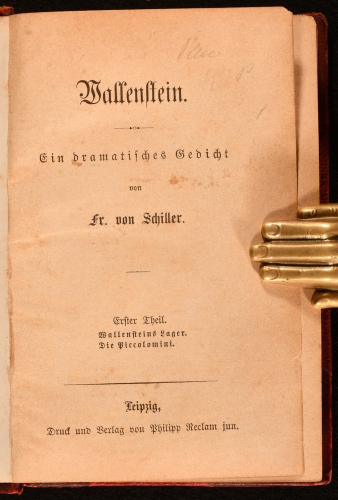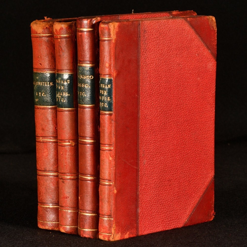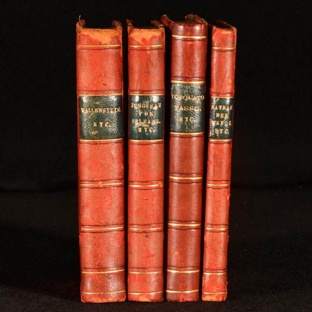 Click here to see our other books! A Collection of Plays by Schiller, Goethe, & Lessing Schiller; Goethe; Lessing c1900 Berlag vin Philipp : Leipzig 5.5" by 4" 120, 126, 104, 192; 96, 104, 64, 63, 87; 133, 93; 114, 49, 126,132pp. SUMMARY Four volumes of collections of works by Schiller, Goethe, and Lessing, in the German language. Leather Binding,Scarce Overall Condition: Very Good This book weighs 1 KG when packed UK Postage: £ 3.99 US Postage: £ 22.99 EU Postage : £ 16.99 European Postage: £ 17.99 Asia Postage: £ 22.99 Worldwide Postage: £ 28.99 DESCRIPTION German language. Four volumes. This collection includes: Two volumes of works by Friedrich Schiler, a German physician, playwright, poet, and philosopher. The works include: Wallenstein, Don Carlos, The Maid of Orleans, Mary Stuart, and The Robbers. One volume of works by Johann Wolfgang von Goethe, a German playwright, poet, novelist, statesman, director, and critic. The works include: Torquato Tasso, Götz von Berlichingen, and Hermann and Dorothea. One volume of works by Gotthold Ephraim Lessing, a German philosopher, dramatist, and art critic remembered as a representative of the Enlightenment Era. The works include: Nathan the Wise, and Minna of Barnhelm. CONDITION Bound in half calf with red boards. Externally, smart with light rubbing and minor bumping to the extremities. Wear to the edges. Fading to the spine. Internally, firmly bound. Pages are bright and clean with the odd pencil annotation. Overall Condition: Very Good GLOSSARY OF TERMS Overall Condition (Dustwrapper condition rating is shown after that for the book itself, where a dustwrapper is present) Fine - Very well preserved copy showing very little wear Very Good Indeed - Only one or two minor faults, really a very attractive copy Very Good - Quite a wide term meaning no major faults but probably several smaller ones often expected given the age of the book, but still a respectable copy Good - Meaning not very good. Some more serious faults as will be described in the condition report under 'condition' Good Only - Meaning one or more faults that could really do with repair Fair - As with good only above but with other faults leaving a compromised copy even after repair Poor - Really bad and possibly seriously incomplete. We only sell books in this condition where their rarity or value makes them attractive none the less. Major defects will be described. GUARANTEE We offer a full money back guarantee on our descriptions. Please ask for details and conditions. We prefer PAYPAL. If you pay via PAYPAL we will post the item off the same or the next working day with the postage you have selected. Please note we cannot accept USD cheques