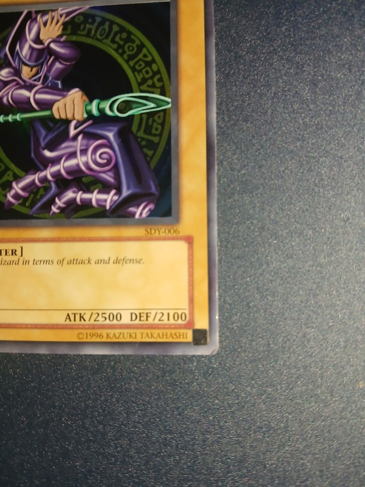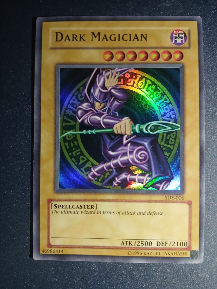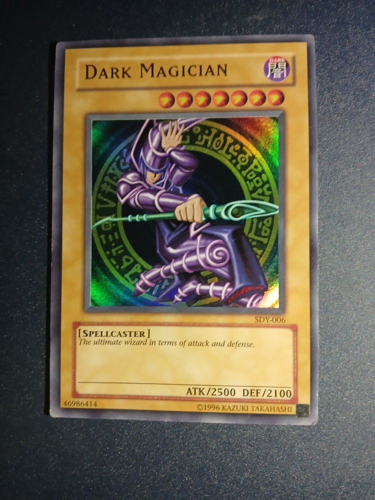 The Dark Magician SDY-006 card from the Yugi set in the Yu-Gi-Oh! TCG is an ultra rare spellcaster card featuring the character Yugi Muto. With an attack power of 2500 and a defense of 2100, this foil card is a valuable addition to any collector's deck. Manufactured by Konami, this card is a part of the Starter Deck series and is in near mint condition or close to it slightlybelow or above, making it a prized possession for fans of the Yu-Gi-Oh franchise card will be shippedin a sleeve inside a hard case then sealed in a water proof package. to ebay where it will be authenticated before being shipped to you by ebay card is sold as is shown in picture I can not insure a certain grade but this is a historical card from the start of Yu-Gi-Oh trading card game and TV series own a great piece of Yu-Gi-Oh history price to high? make a counter offer