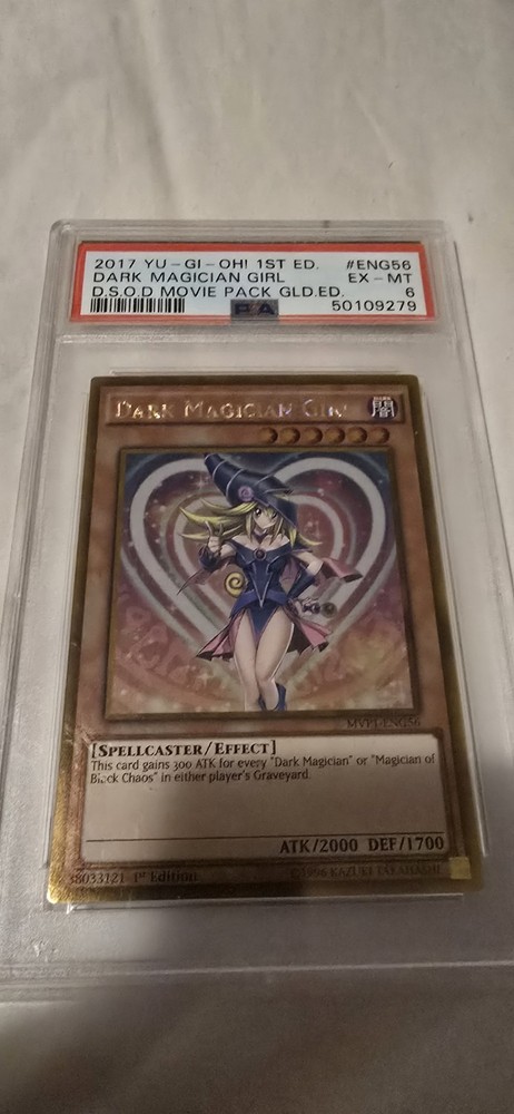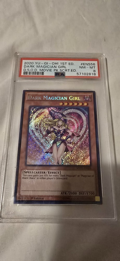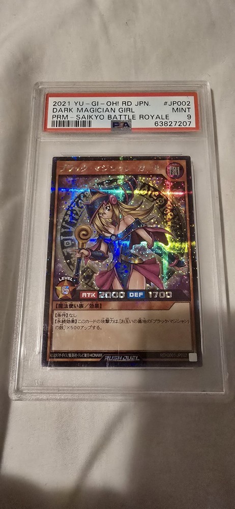 The product is a Dark Magician Girl card from the Yu-Gi-Oh! TCG, specifically related to the Rush Duel format. It has been graded by PSA, with one card at a PSA 9 rating and two others at PSA 8 and PSA 6. This card is highly sought after by collectors and fans of the Yu-Gi-Oh! trading card game due to its iconic and powerful nature. The Dark Magician Girl card is known for its association with the Dark Magician archetype and is a popular choice in competitive play.