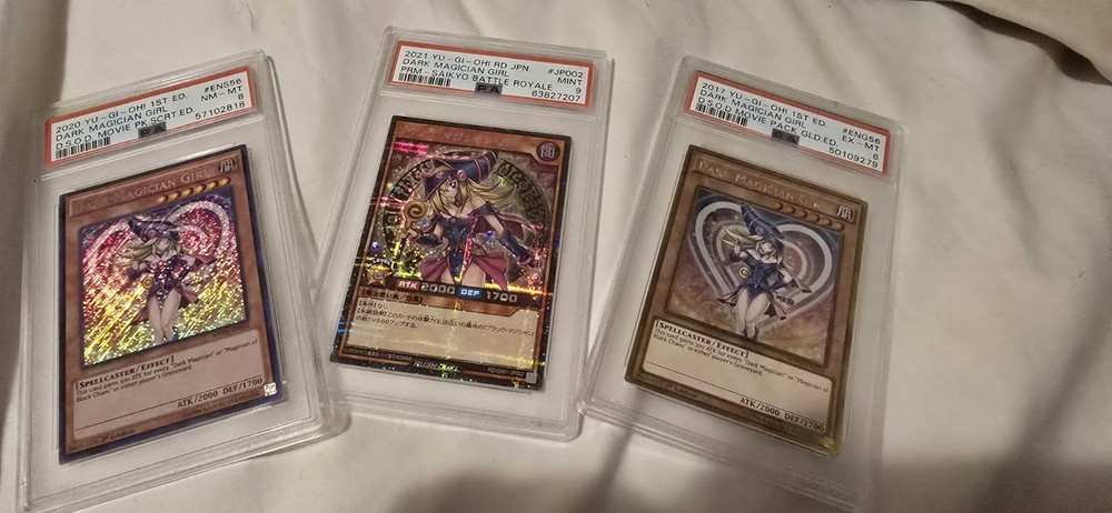 This Dark Magician Girl Rush Duel trio is a must-have for any Yu-Gi-Oh! collector! The PSA 9 gem is flawless, while the PSA 8 and 6 still shine bright. As one of the most iconic cards in the game, it’s perfect for both competitive decks and display. The grading ensures authenticity and quality, making it a fantastic addition to any collection. Fans of the Dark Magician archetype will absolutely love owning this powerful and nostalgic piece. Highly recommended!